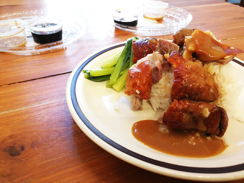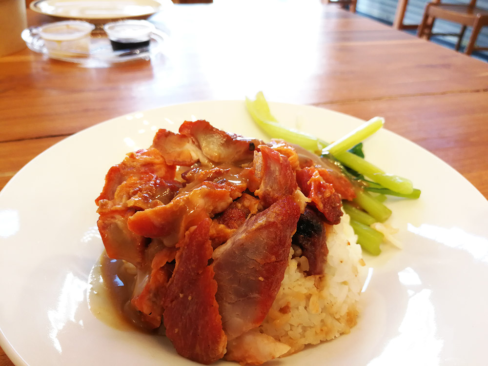 สำหรับเมนูนี้คือ ข้าวหมูแดง เมนูมาตรฐานที่เห็นกันได้ทั่วไปครับ สิ่งที่แตกต่างคือ หมูแดงที่ย่าง เวลากินจะรู้สึกเหมือนมีกลิ่นหอมสมุนไพรบางอย่างด้วยคล้ายๆกลิ่นใบเตย น่าจะมีการเอาไปใส่ตอนย่างหรือรมควันไว้ เนื้อหมูมีมันแทรกไม่มากนัก ถือว่ากินได้แบบไม่ต้องกลัวอ้วน ชิ้นหมูขนาดปานกลาง ความนุ่มอยู่ในระดับมาตรฐาน มีผักกวางตุ้งเคียงมาให้ และมีน้ำราดมาให้ด้วยครับซึ่งเป็นน้ำราดเดียวกับเมนูไก่นั่นเองครับ
