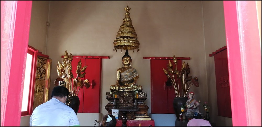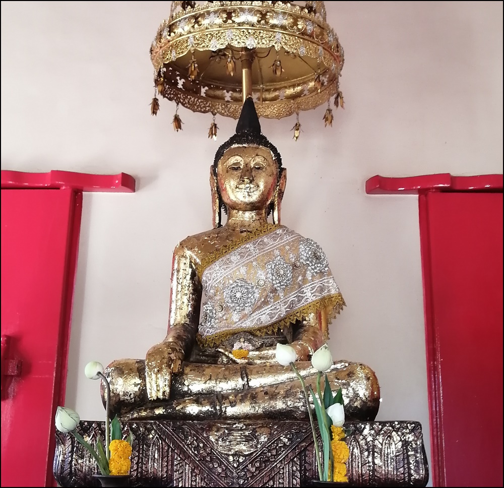 เราเห็นองค์หลวงพ่อเจ้าวัดแล้วนึกไปถึงพระในศิลปะภาคอีสานในประเทศไทย(ศิลปะล้านช้าง) โดยเฉพาะพระพักตร์ ที่พระนาสิกเป็นสัน ร่องเหนือพระโอษฐ์เชื่อมต่อกับพระนาสิก และลักษณะพระโอษฐ์ที่ปลายตวัดขึ้นให้มองเห็นเหมือนกำลังทรงแย้มพระโอษฐ์ ส่วนพระรัศมีที่เป็นสามเหลี่ยมสูงขึ้นไปให้นึกถึงองค์หลวงพ่อโสธร หลวงพ่อเจ้าวัดอยู่ในปางมารวิชัย ขัดสมาธิราบ นิ้วพระหัตถ์ทั้งสี่เสมอกัน