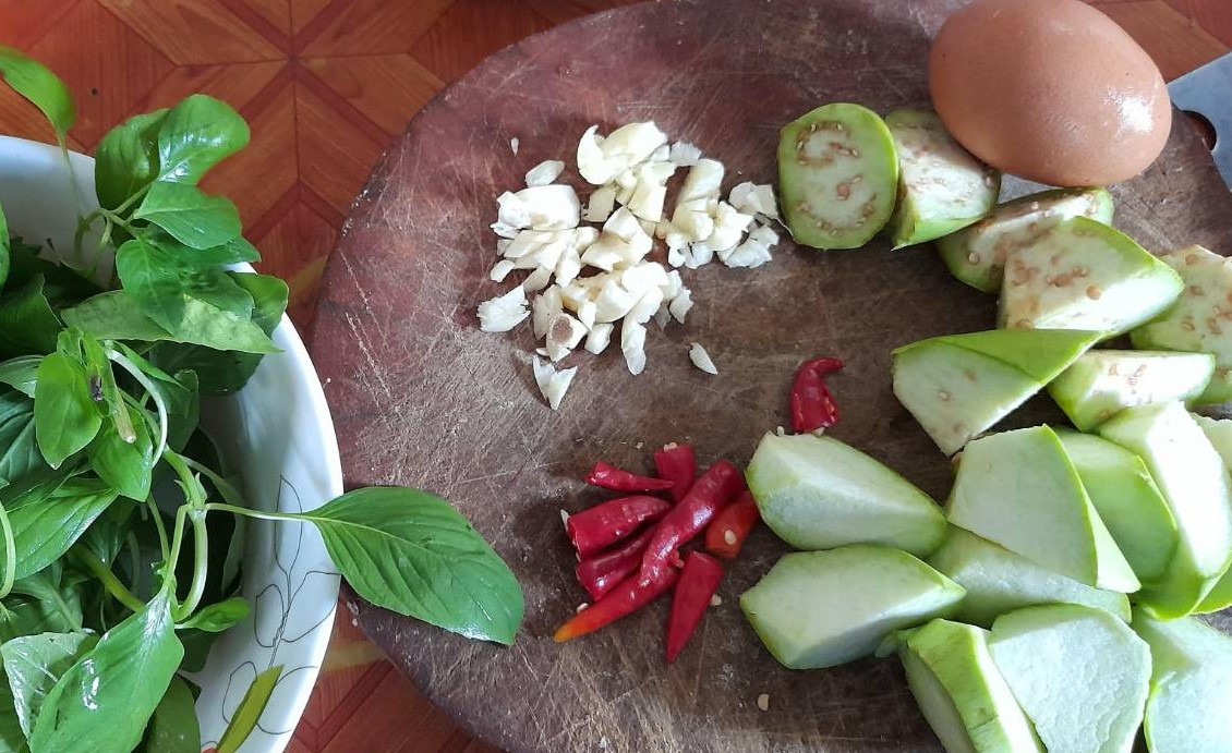...ส่วนผสมก็ตามภาพครับ เจียวกระเทียมให้เหลืองหอม ก็ตอกไข่ใส่ ใส่มะเขือยาว ผัดให้สุก แล้วก็ปรุงรสตามชอบเลย กินเองคนเดียวฮาๆ ปิดท้ายด้วยใบโหระพาสดๆ จากต้น....