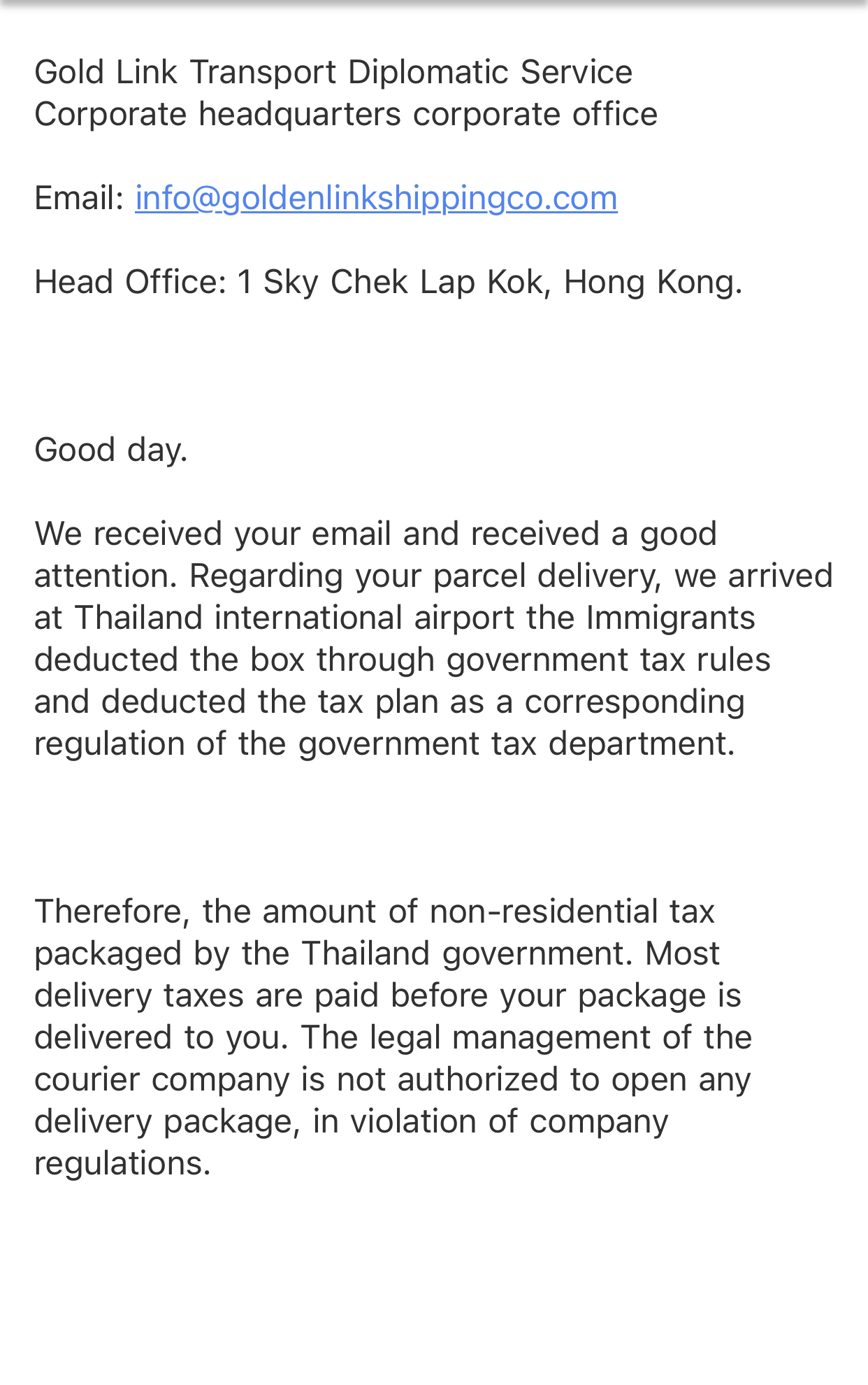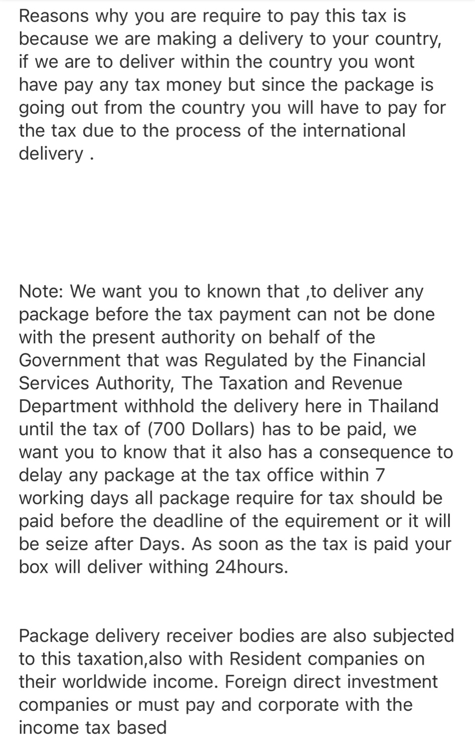 พี่สาวเราเเชทเล่นกับฝรั่งเเล้วบอกว่าจะส่งของมาให้ แล้วให้จ่ายภาษีก่อน ตั้ง 700 dollars เลยอยากถามว่าบริษัทพวกนี้มีจริงไหม ในใจคือคิดว่าพี่สาวคงโดนหลอกมากกว่า พวก scammers