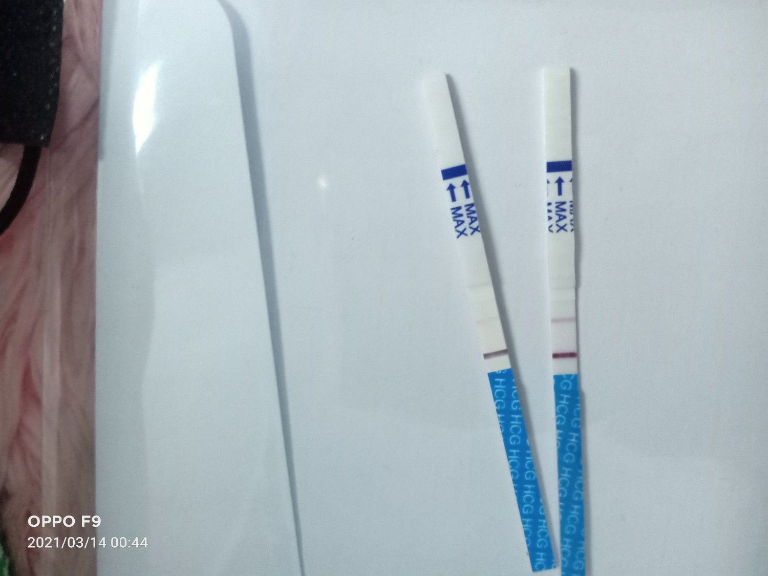 แบบนี้ท้องมั้ยคะหรือว่าที่ตรวจพัง เราตรวจสองรอบรอบแรกขึ้น2ขีดค่ะตามรูป รอบสองเป็นขีดจางๆแทบมองไม่เห็น แล้วอีกวันมีเลือดออกค่ะไม่แน่ใจว่าใช่ประจำเดือนมั้ย เลือดออกได้2วันแล้ว สีแดงสดค่ะ ปวดท้องตลอด หน้