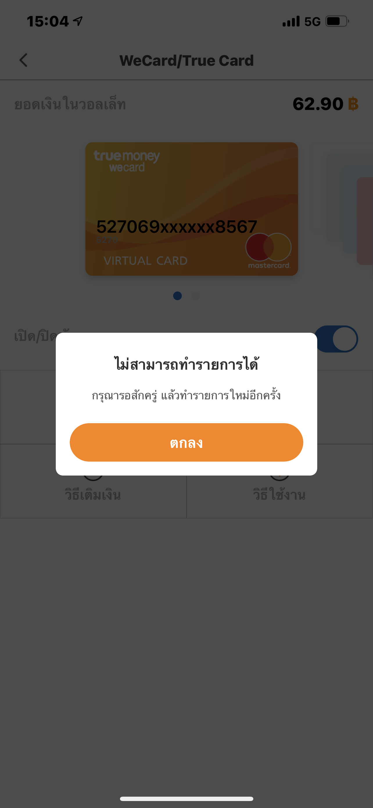 คือเราจะดูเลขบัตร wecard ของ true money แต่พอเรากดดูเลขบัตรและใส่รหัสถูกต้องแล้ว มันขึ้นว่า ไม่สามารถทำรายการได้ อ่ะค่ะ ต้องแก้ยังไงหรอคะ??