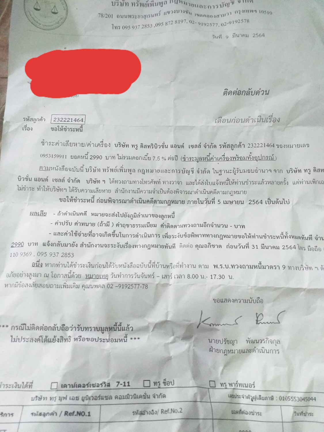 มีจดหมายทวงค่าเครื่องโทรศัพท์ทรูส่งมาบ้าน