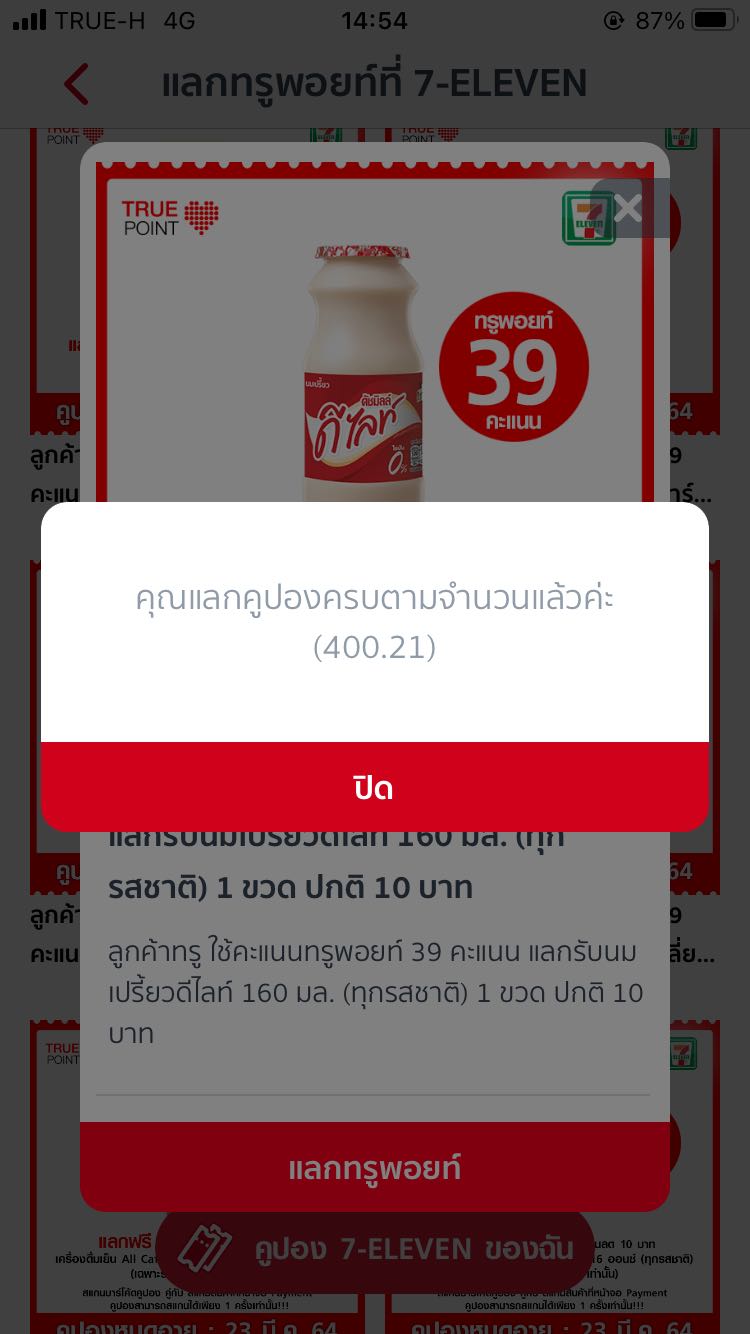 คือได้ทำการกดแลกซื้อแซนวิสและสะสมไว้ในคูปองแล้วเรียบร้อยหนึ่งชิ้น พอจะกดแลกซื้อนมเปรี้ยว ระบบกลับขึ้นอย่างนี้