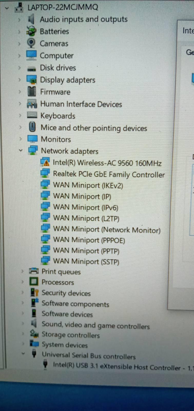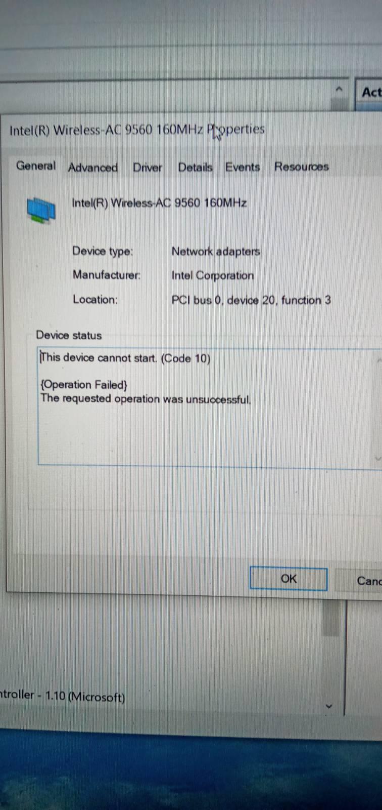 โน๊ตบุ๊คผมWiFi เล่นได้บ้างไม่ได้บ้าง โดยที่ตรง intel wireless ac 9560 ขึ้นเครื่องหมายตกใจ(code 10)ครับ ผมต้องแก้ปัญหายังไงได้บ้างครับ