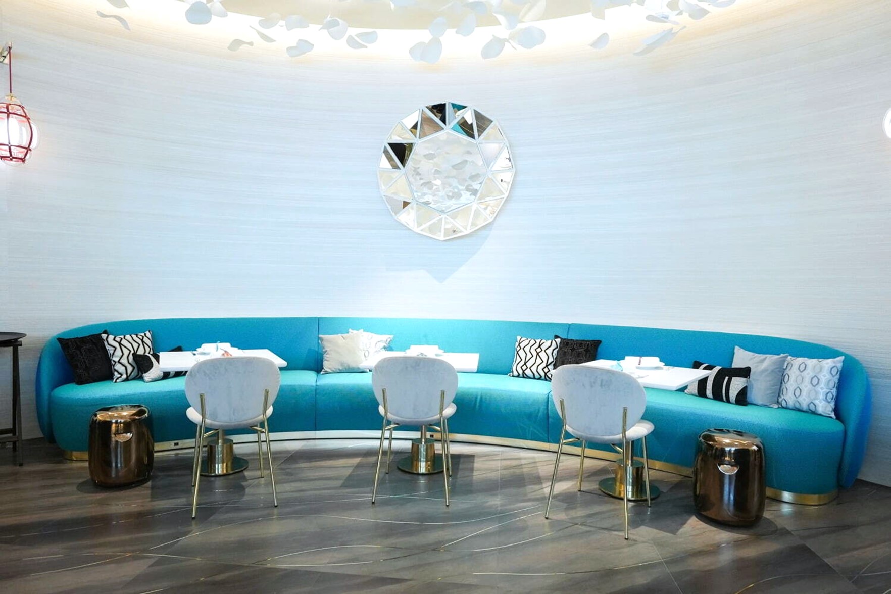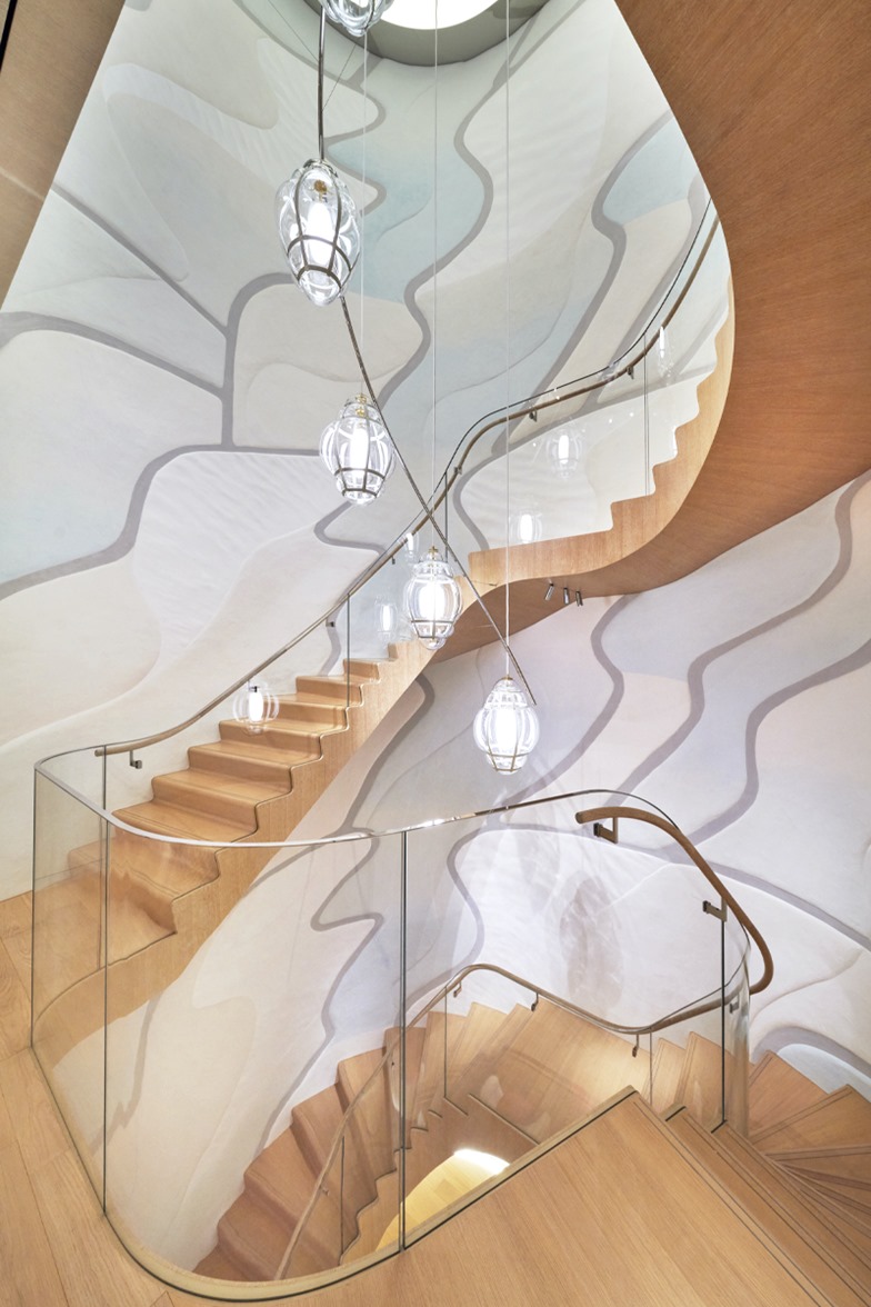 กลางร้านจะเป็นบันไดวนที่ตกแต่งด้วยลายคลื่นสีฟ้า เพื่อเพิ่มความสดใสเป็นธรรมชาติให้กับร้าน