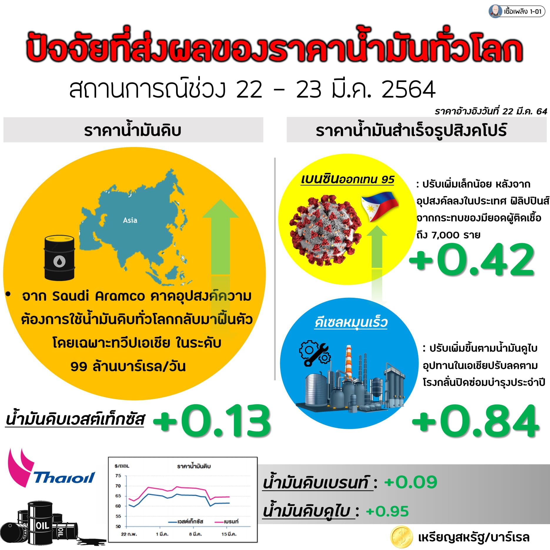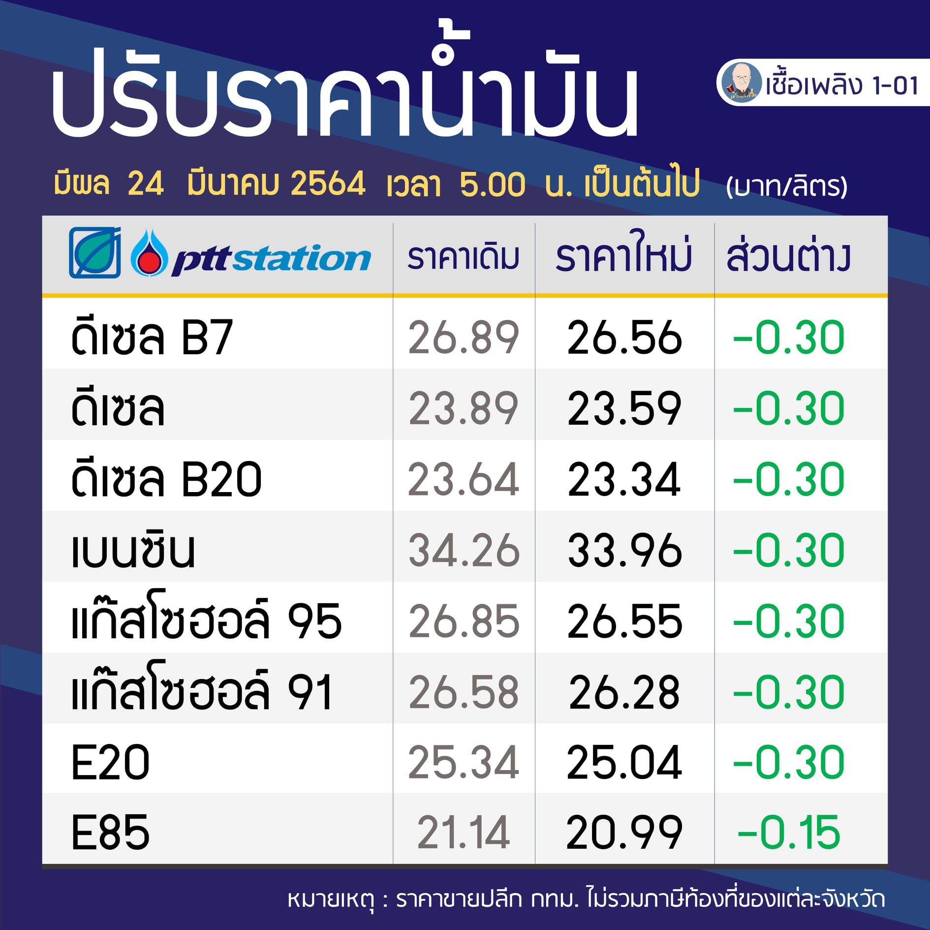 24 มี.ค. 64 ปรับราคาน้ำมันลง 30 สต. เนื่องจากราคาตลาดโลกผันผวน