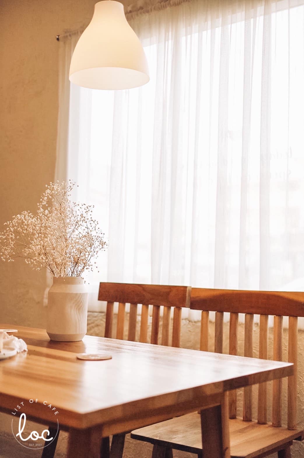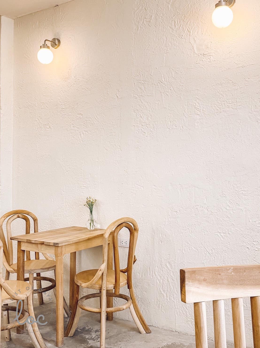 บรรยากาศภายในร้าน คลุมโทนดีที่สุดร้านสีขาวตัดกับเฟอร์นิเจอร์ไม้ จัดวางโต๊ะแบบโปร่งๆ นั่งสบาย
