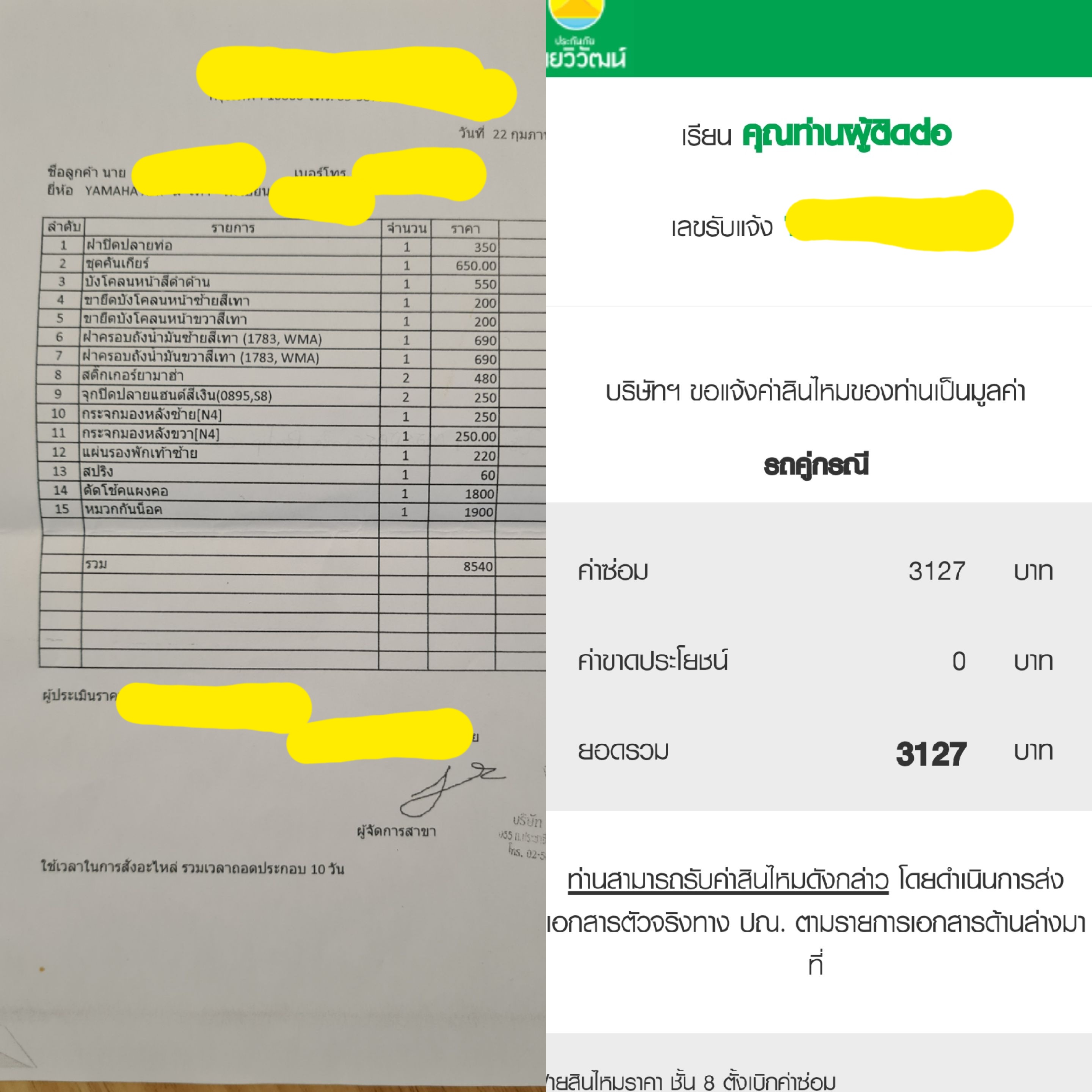 เป็นรถคุ่กรณีต้องการร้องเรียนการปฏิบัติงานที่ล่าช้า และประวิงเวลาการพิจารณาค่าสินไหม กับบมจ.ไทยวิวัฒน์ เพื่อเรียกร้องค่าสินไหมในการซ่อมรถ100% จากราคาประเมิณของศูนย์YAMAHA และค่าขาดประโยชน์จากการ ใช้รถนับตั้งแต่วันที่รถได้รับอุบัติเหตุ ไม่สามารถใช้งานได้จนถึงวันที่รถได้ถูกซ่อมแซมเปลี่ยนอะไหล่จนครบถ้วน 100% ตามค่าใช้จ่ายจริงที่เกิดขึ้น