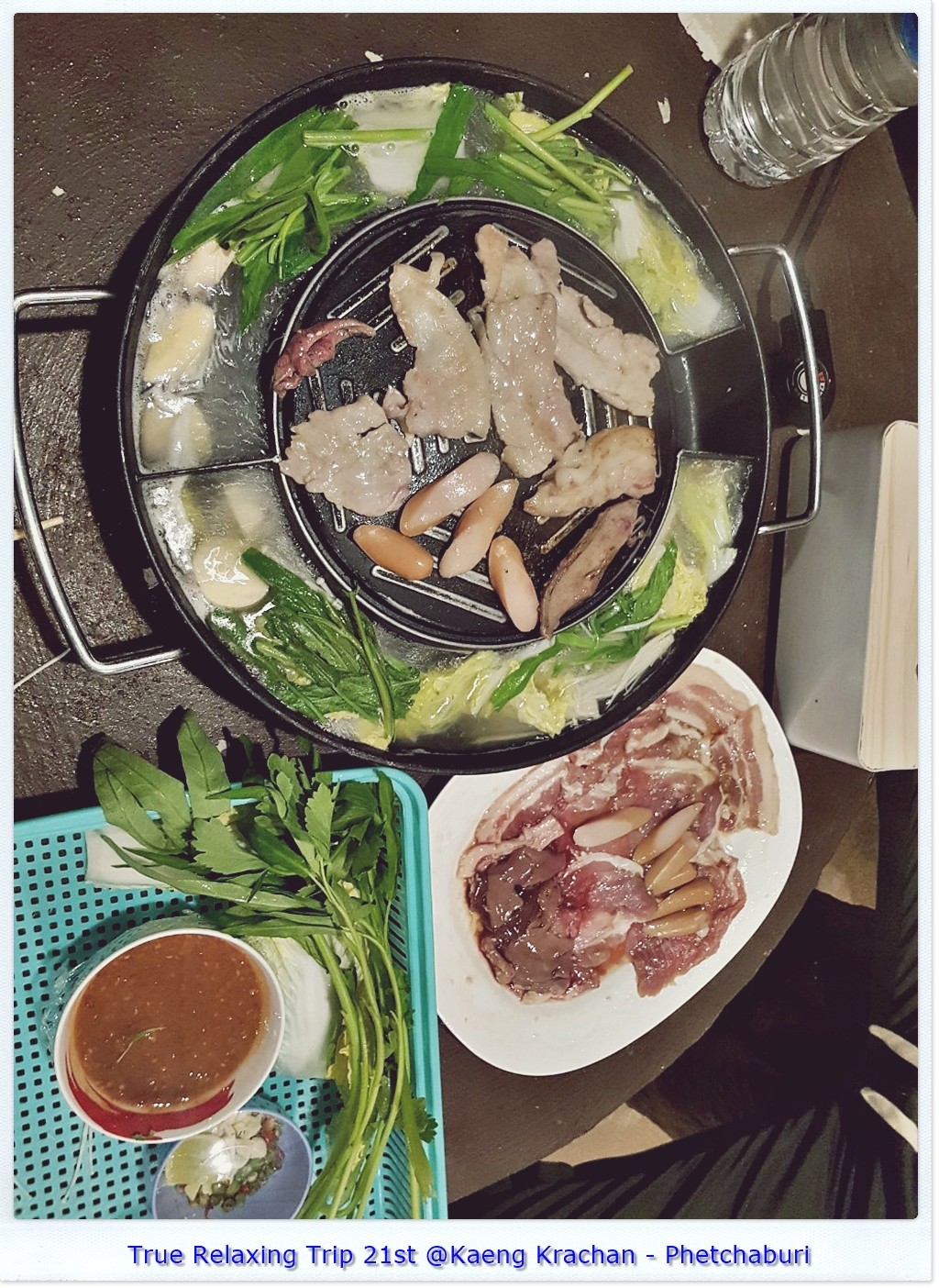 ตกเย็นก็สั่งชุดหมูกระทะจากที่พักได้เลย มีบริการถึงทุ่มครึ่ง ราคาชุดละ 350 บาท แต่ถ้าไม่พอสั่งเพิ่มได้ เลยสั่งชุดหมุเพิ่ม 100 บาท ถือว่าราคา 350 บาท/ชุดแล้วปริมาณแค่นี้ น้อยไปนิด แต่ของเค้าดีนะ เนื้ออร่อย หมักมาดี สามชั้นดูดี ดูหนา ผักให้มาน้อยไปนิด น้ำจิ้มให้มาเยอะมาก อร่อยดี ถือว่าดีถ้าไม่ติดที่เวลาปิ้งไปกระเด็นไป เจ็บมือไปหมด กินเสร็จก็นอนได้ ตอนนอนก็ทำใจนิดหน่อยนะ ยิ่งถ้าเป็นคนเข้าห้องน้ำบ่อยๆ ยิ่งลำบาก เพราะห้องน้ำอยู่ข้างนอก เวลาจะเข้าห้องน้ำทีต้องรูดซิปเต้นท์ออกมา ซึ่งเสียงมันก็จะดังๆหน่อย คนที่นอนด้วยก็จะตื่นกันหมด เข้าออกก็จะลำบากหน่อย สรุปการนอนเต้นท์ครั้งแรก....อยากหาทำอีก 5555+ มันไม่ใช่แนวจริงๆ