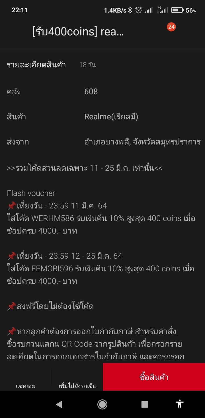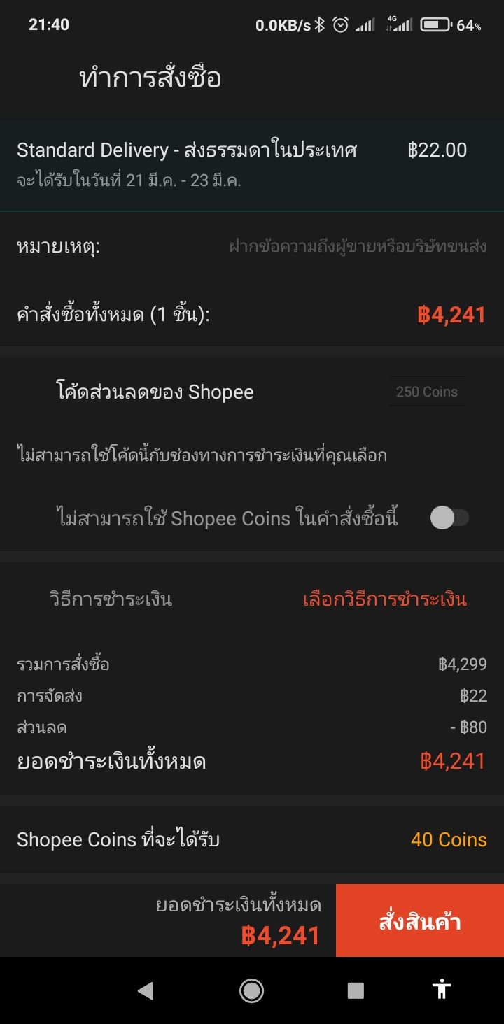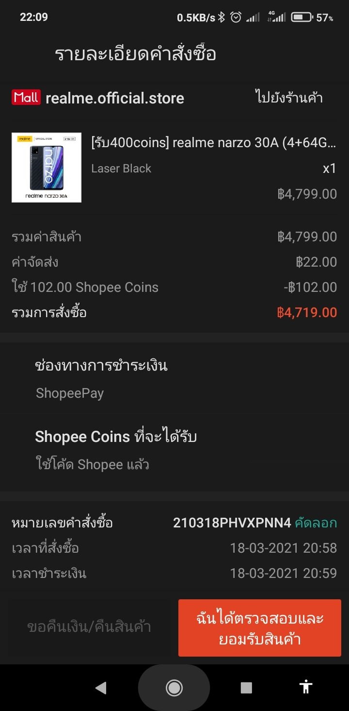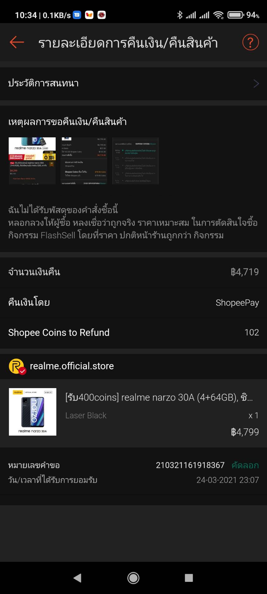 เหตุการณ์ เกิดขึ้นวันที่ 18 มีนาคม 2564 ผมได้ทำการสั่งซื้อของ จากกิจกรรม Flashsale เป็นมือถือ จาก Mall Official ของ Shopee โดยวันนั้นตั้งราคาหน้ากิจกรรม 4,799 บาท สั่งผมก็ตรวจดูการใช้ Code ตรวจดูการใช้เหรียญ พร้อมกับตัดสินใจสั่งซื้อ รวม 4,719 บาท จากผ่าน Shopee Pay ระบบบันทึกเรียบร้อย แต่ . . เอ๊ะ ก่อนจ่ายบอกไม่เสียค่าจัดส่ง ดันเสียเพิ่ม 22 บาท ไม่เป็นไร ช่างมัน!!