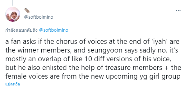 ซึงยูนกล่าวว่าท่อนคอรัสในเพลง 'IYAH' คือเสียงของ YGNGG และเมมเบอร์ TREASURE