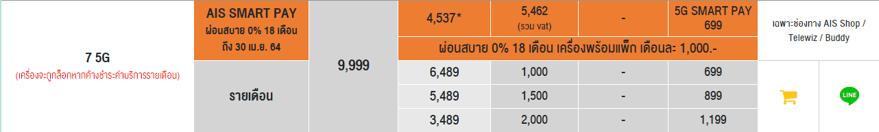 อ้างอิงตามภาพ ถ้ามีอันไหนผิดแก้ไขได้เลยนะครับ ถ้าผมจะใช้โปร AIS Smart Pay (มีเบอร์รายเดือน AIS อยู่แล้ว) ผมจะต้องไปติดต่อที่ศูนย์ตามที่ระบุ ทำสัญญา 18 เดือน เปลี่ยนมาใช้โปร 5G 699 ไม่ต้องจ่ายค่าบริการล่วงหน้าใดๆ รับเครื่องกลับได้วันนั้นเลย แต่ว่าทุกเดือนจะมีบิลมาเก็บเงินเดือนละ 1,000 บาท (ไม่รวมค่าบริการนอกแพ็กเกจ แต่รวม VAT แล้ว ถ้าไม่ใช้นอก Package เลยก็จ่ายแค่ 1,000 บาท Net) ก็จ่ายไปตามนั้น ครบ 18 เดือนก็ถือเป็นสิ้นสุดสัญญา จะเปลี่ยนโปรกลับเป็นเติมเงินหรืออะไรก็ได้