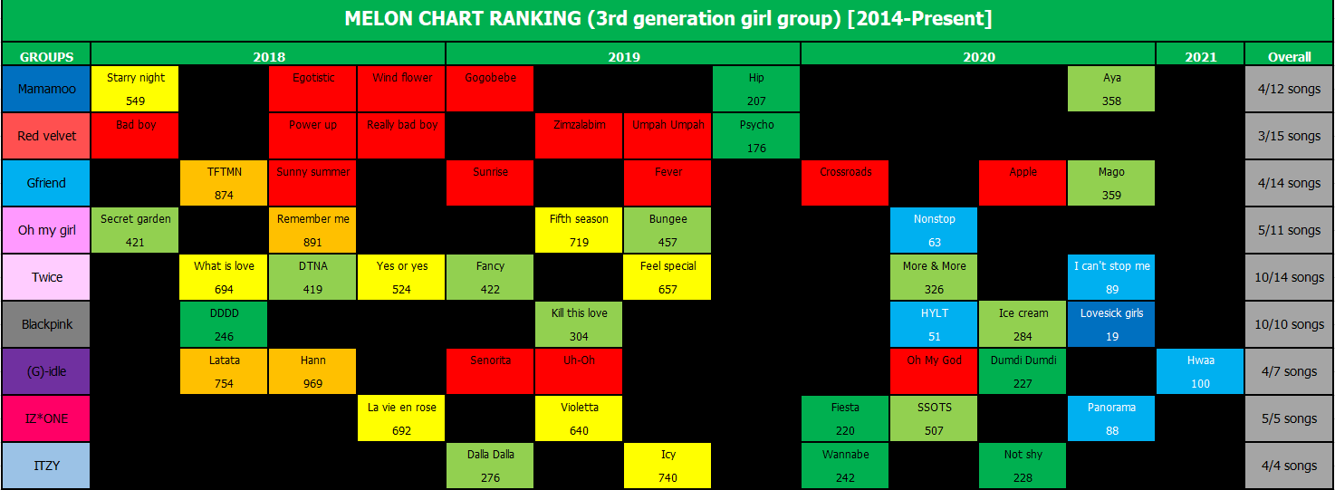 Update อันดับเพลง Title track ของเหล่า 3rd-4th Generation Girl group ใน Melon Chart Top 1000 ล่าสุด [1Q 2021]