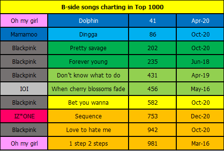1. เพลงใหม่ ที่ปล่อยออกมาและยังสามารถติดชาร์ตได้อยู่ในขณะนี้ : Aya (Mamamoo), Mago (Gfriend), I cant stop me (Twice), Ice cream (Blackpink), Lovesick Girls (Blackpink), Dumdi Dumdi ((G)-idle), Hwaa ((G)-idle), Not shy (ITZY), Panorama (IZ*ONE), Unnatural (WJSN), After School (Weeekly)