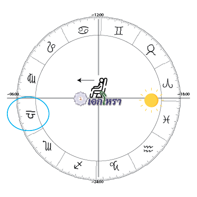 และ 🌞 พระอาทิตย์ที่อยู่ ♈ ราศีเมษ ตกไปประมาณ 10 นาทีแล้ว ( เราทราบว่า 4 นาที เคลื่อน ~1°) เป็นสาเหตุให้ลัคนาเคลื่อนเข้าเขต ♎ ราศีตุลย์ ~2° 30' (ภาพประกอบด้านล่าง เส้นวงสีฟ้า)