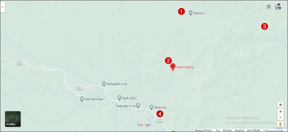 จากภาพด้านบน ถ้าเราค้นหาใน google map ว่าวัดหลวงขุนวิน ระบบจะมาปักหมุดให้ที่หมายเลข (2) ซึ่งขอการนำทางจะได้เส้นทางที่ใช้ทางหลวงหมายเลข 1013 ถึงวัดสบวินก็เลี้ยวขวาขึ้นมาจนถึงจุดหมายเลข (2) แต่ตรงนี้ยังไม่ใช่วัด เป็นแค่จุดเริ่มต้นของถนนเข้าวัดยาวกว่า 10 กิโลเมตร โดยตัววัดจริงๆ จะอยู่ที่หมายเลข (1)