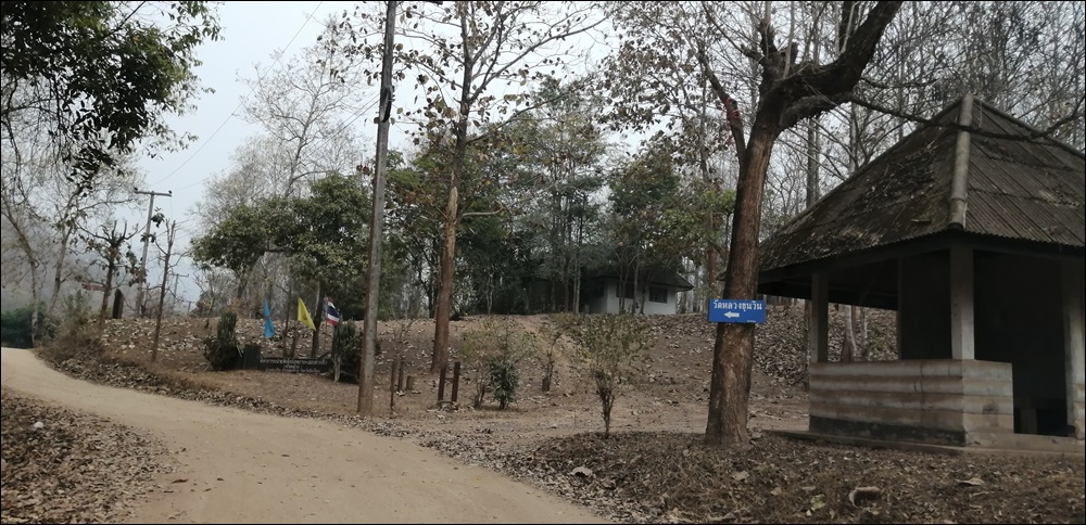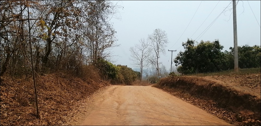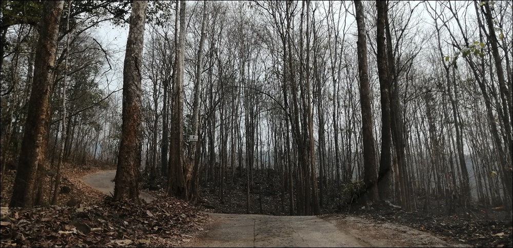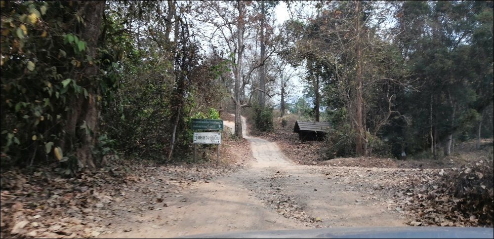 และเส้นทางหลังจากนั้นจะเป็นคอนกรีตเสียเป็นส่วนใหญ่ ไม่เรียบครับ น่าจะเพราะตั้งใจให้ช่วยป้องกันการลื่นไถลของรถที่จะขับขึ้นมา หรือลงสุ่พื้นราบ แต่ยังไงก็ยังมีป้ายแนะนำทางว่ามุ่งหน้าสู่วัดหลวงขุนวินเป็นระยะๆ โดยข้างทางมีร่องรอยของไฟป่าจนดูแห้งแล้งไปทั่ว ต้นไม้ยื่นต้นทิ้งใบเกือบทั้งหมดไปทั่วทั้งป่า