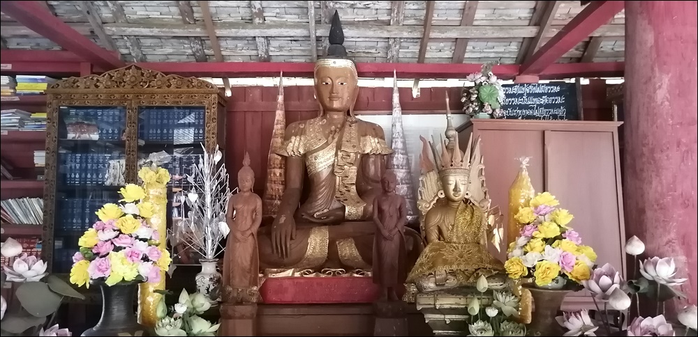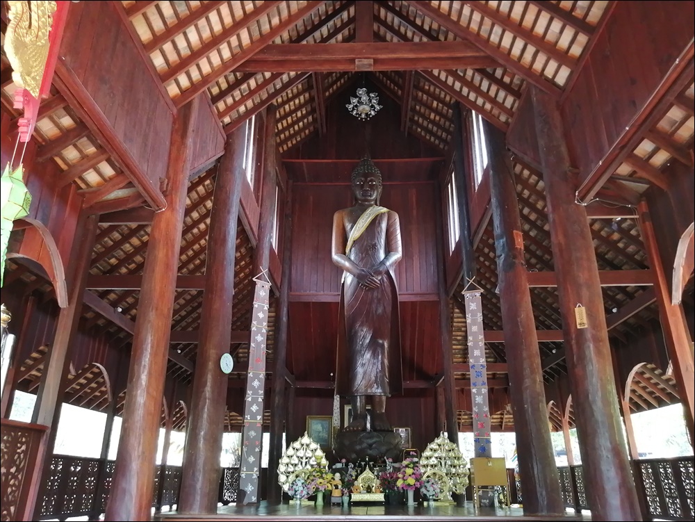 พระพุทธรูปยืนปางจงกรมแก้วแกะสลักจากซุงไม้จำปี ประดิษฐานเป็นประธานในโบสถ์พระยืน (วิหารพระยืน) ที่ทำจากไม้ทั้งหลัง ที่หน้าบันของหลังคาชั้นล่างสลักเป็นรูปนกยูงลำแพนพร้อมลวงลายกนก ส่วนหน้าบันของหลังคาชั้นบนสลักเป็นรูปธรรมจักร ซึ่งเป็นเครื่องหมายหนึ่งของศาสนาพุทธ