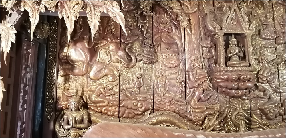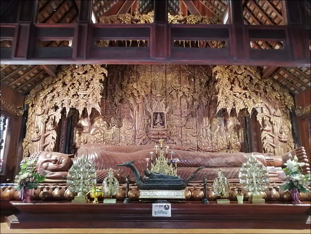 พระพุทธรูปนอนปางไสยาสน์แกะสลักจากซุงไม้จำปี ในภาพจะเห็นต้นสาละคู่และความโศกเศร้าของบรรดาสิงห์สาราสัตว์รอบข้าง รวมทั้งเหล่าเทพเทวดาทั้งหลาย ซึ่งจัดเป็นการเล่าพุทธประวัติตอนปรินิพพานอย่างชัดเจน ส่วนตัวอาคารสร้างจากไม้ทั้งหมด หลังคาสามชั้นที่หน้าบันด้านหน้าของวิหารสลักเป็นรูปบุษบกที่ลอยอยู่เหนือก้อนเมฆ ตรงกลางของสันหลังคาประดับด้วยฉัตรทอง โดยอาคารทั้งหลังถูกล้อมรอบด้วยนาค 2 ตัวหันหน้ามาทางด้านหน้าของวิหาร ส่วนอีก 2 ตัวหันหน้าไปทางด้านหลัง และหางของนาคมาบรรจบกันที่กึ่งกลางของวิหารทั้งสองฝั่ง
