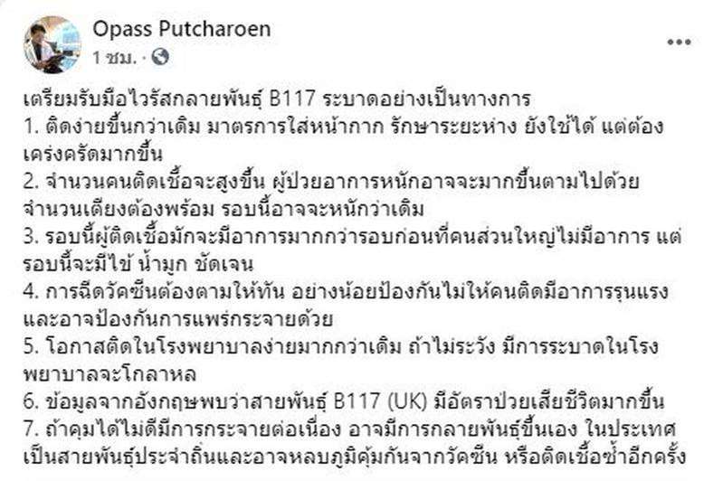 ผศ.นพ.โอภาส พุทธเจริญ หัวหน้าศูนย์โรคอุบัติใหม่ทางคลินิก โรงพยาบาลจุฬาลงกรณ์ สภากาชาดไทย โพสต์เฟซบุ๊ก "Opass Putcharoen" ระบุข้อความว่า เตรียมรับมือไวรัสกลายพันธุ์ B117 ระบาดอย่างเป็นทางการ