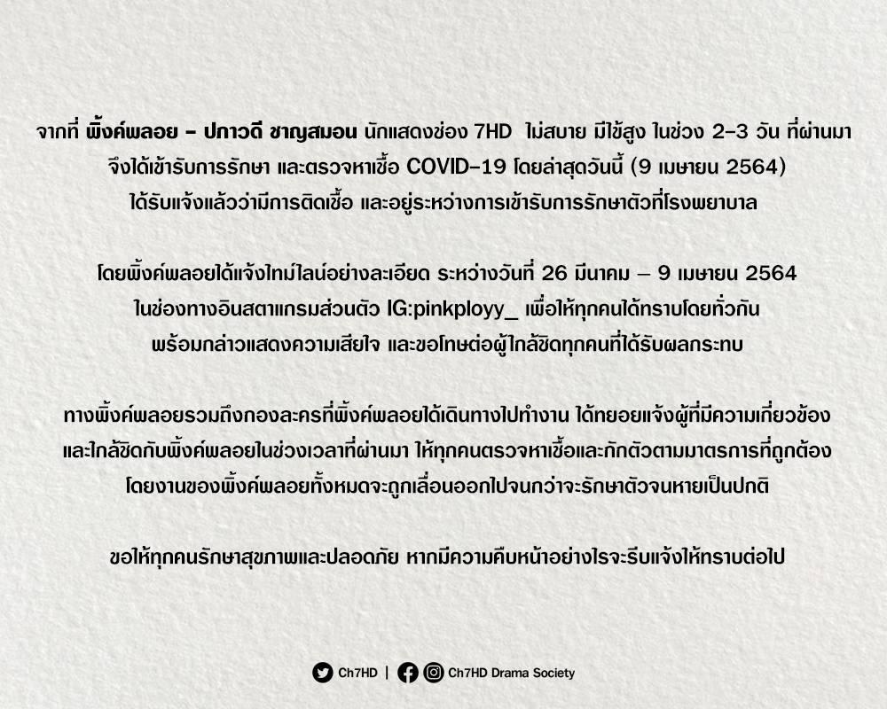 📍แจ้งอัปเดต จากที่ #พิ้งค์พลอยปภาวดี นักแสดง #ช่อง7HD ตรวจพบเชื้อ COVID-19