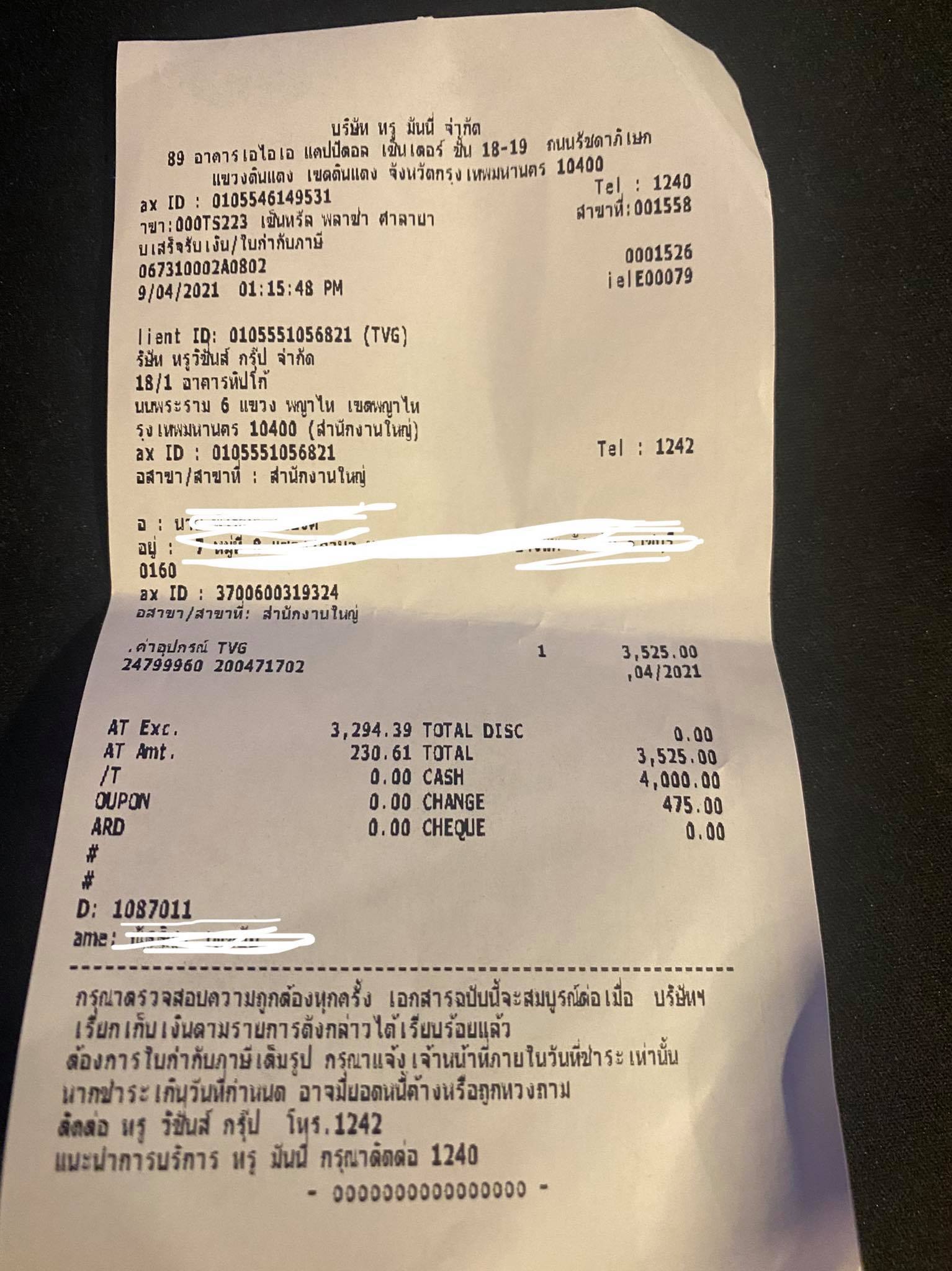 ต่อมาจนวันที่ 9 เมษายน ผมได้เตรียมเอกสารและเข้าไปทำการยกเลิก โดยมีเราส์เตอร์อินเทอร์เน็ตและอแดปเตอร์ ไปคืน (ไม่มีกล่องทรูวิชันส์) ก็ได้ทำเรื่องยกเลิกปกติ จนพนักงานบอกราคาค่าปรับกล่องทรูวิชันส์มาว่า 3,500 เศษๆ ผมตกใจอยู่พักนึง แต่ด้วยความที่ไม่รู้เรื่องอะไรเยอะ ก็เลยเซ็นใบที่พนักงานยื่นมาให้เซ็น พร้อมเขียนเหตุผลที่ยกเลิก และจ่ายเงินไปให้จบ ๆ แต่มันสะกิดใจอยู่อย่างนึง เพราะผมถามพนักงานว่า มีใบเสร็จใช่ไหมครับ และพนักงานได้ตอบแบบเลิ่กลั่กว่ามีค่ะ และเขาได้หันไปถามพี่พนักงานคนข้าง ๆ ไม่ทราบว่าถามอะไรกัน และเขาก็ได้พิมพ์ใบเสร็จตัวนี้มาให้ผม ซึ่งผมไม่ทราบว่ามันคือบิลสำหรับค่าปรับจริง ๆ หรือ คือบิลว่าผมซื้อกล่องทรูวิชันส์ในราคาเท่านี้ (อยากให้ผู้รู้ช่วยดูหน่อยครับ)