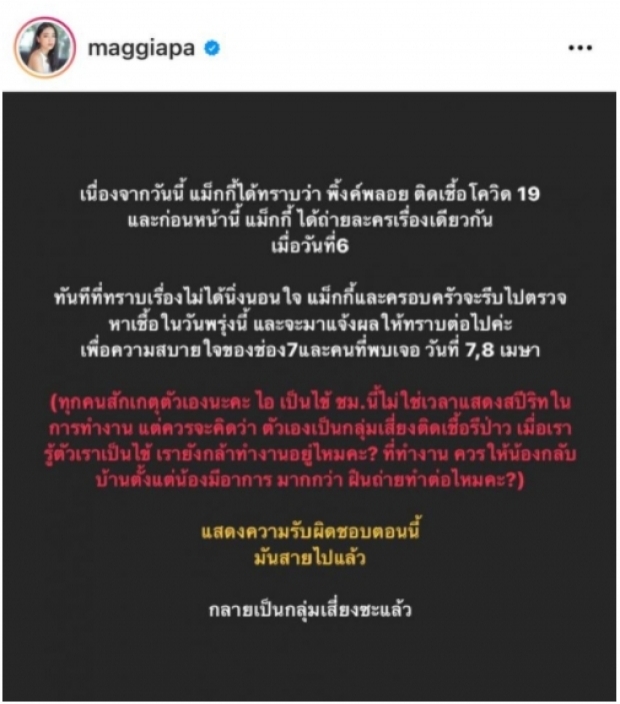 เนื่องจากวันนี้ แม็กกี้ได้รับทราบว่า พิ้งค์พลอย ติดเชื้อโควิด19 และก่อนหน้านี้ แม็กกี้ ได้ถ่ายละครเรื่องเดียวกัน เมื่อวันที่6 ทันทีที่ทราบเรื่องไม่ได้นิ่งนอนใจ แม็กกี้และครอบครัวจะรีบไปตรวจหาเชื้อในวันพรุ่งนี้