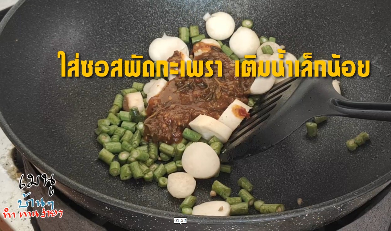 2.นำผักลงไปผัดใช้ไฟแรง ๆ ซักครึ่งใส่ซอสผัดกะเพรา เติมน้ำ ใส่วุ้นเส้น ผัดไปจนกว่าวุ้นเส้นจะดูดน้ำซอสเข้าไปจนเกือบแห้ง