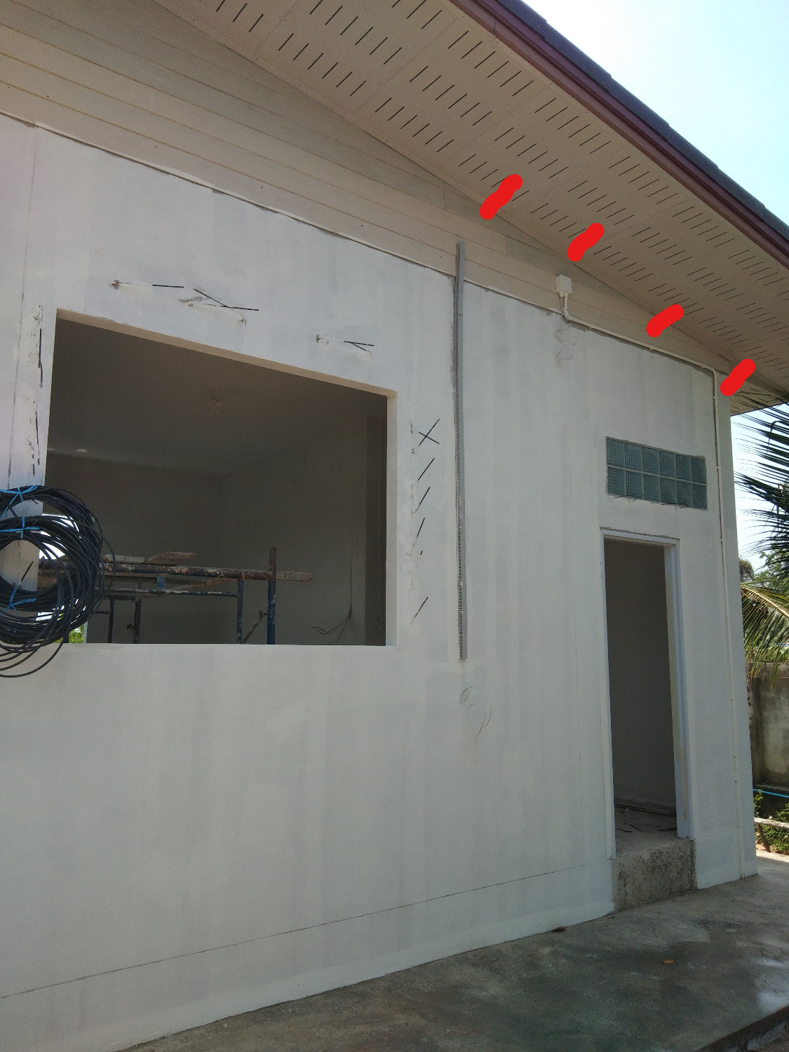 กำลังจะต่อชายคาออกมาบังแดดด้านทิศตะวันตก แต่ปรากฏว่ามีสายไฟ รางสายไฟ พาดลงมาจากข้างบน