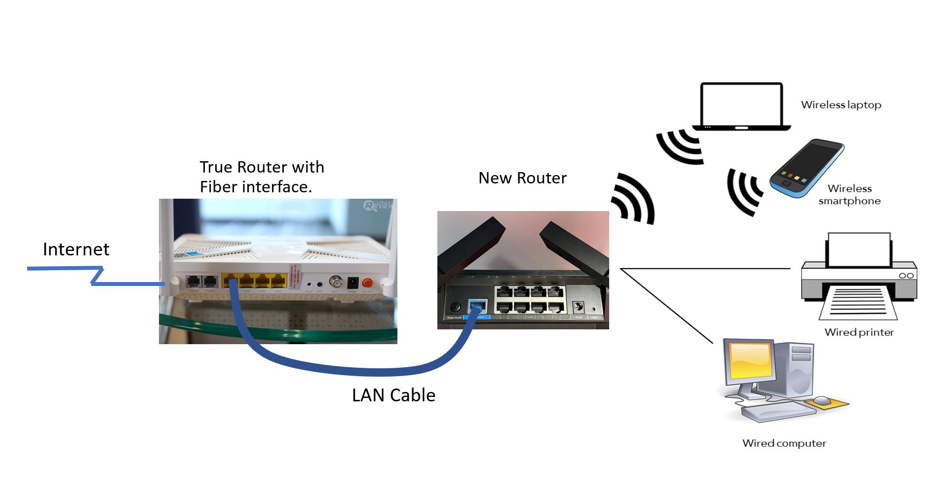 สำหรับ Router ที่ผมกล่าวถึงหรือรุ่นอื่นๆในท้องตลาดส่วนใหญ่จะไม่มีพอร์ตสำหรับรองรับสาย Fiber เหมือน Router ของ True นะครับ แต่จะมีพอร์ตที่เขีpoว่า WAN ซึ่งเป็นพอร์ต RJ45 เหมือนสาย LAN ปกตินั่นแหล่ะ ซึ่งพอร์ตนี้เราจะเอาไว้พ่วงกับพอร์ต LAN ของ Router True ด้วยสาย LAN นั่นเอง