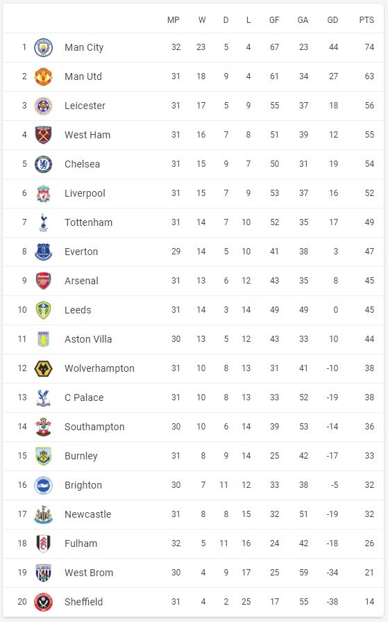 แชมป์ แมนซิตี้ รองแชมป์ เชลซี อันดับ 3 แมนยู อันดับ 4 ลิเวอร์พูล หงส์แดงขาดแรงจูงใจเพราะได้แชมป์ลีกครั้งแีกในรอบ 30 ปี ไปแล้ว