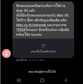 ใช้งานมาได้สักพัก 5G ไม่ได้โผล่มาเลย ใส่กับเครื่องซัมชุง A32 5G ลองกดเปิดใช้งานสิ่เผื่อจะรีเซ็ตสัญญาณใหม่ ได้รับ SMS “ซิมของคุณพร้อมใช้งาน dtac 5G แล้ว แต่ทั้งนี้ มือถือคุณจะรองรับ dtac 5G ได้เร็วๆนี้ค่ะ”