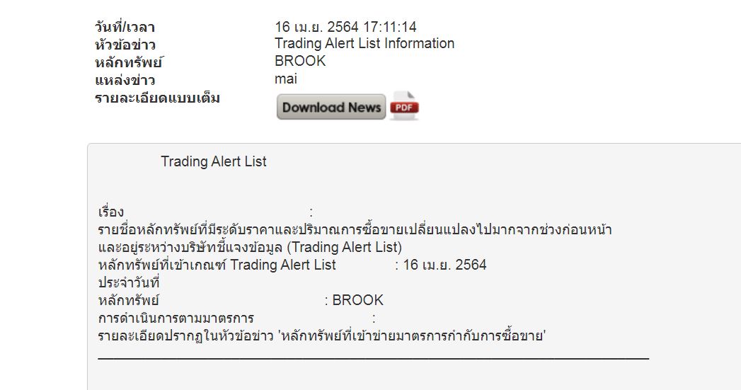 ตัวแม่ brook โดนมาตรการ Trading Alert ติด Cash เริ่ม 19/4/2564 เป็นเวลา 3 สัปดาห์
