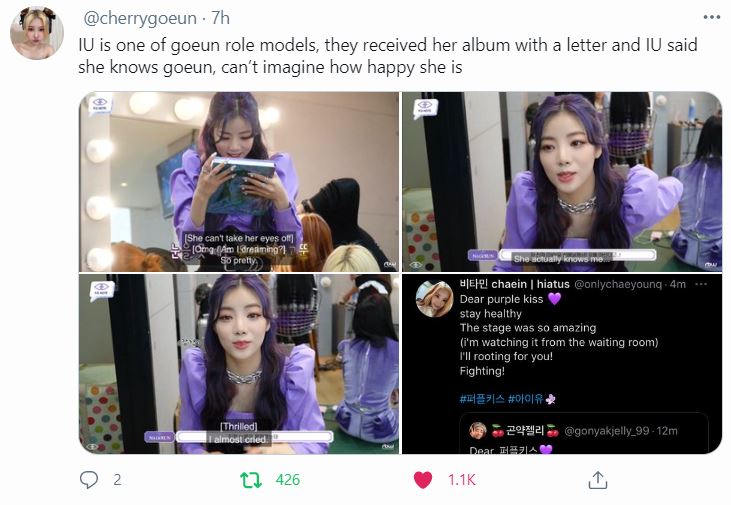 ไอยูให้อัลบั้มพร้อมลายเซ็นให้กับน้องๆวง Purple Kiss ที่พึ่งเดบิวต์ น้องโกอึนขอบคุณไอยูที่เอ็นดูและให้กำลังใจวงจูบม่วงด้วย