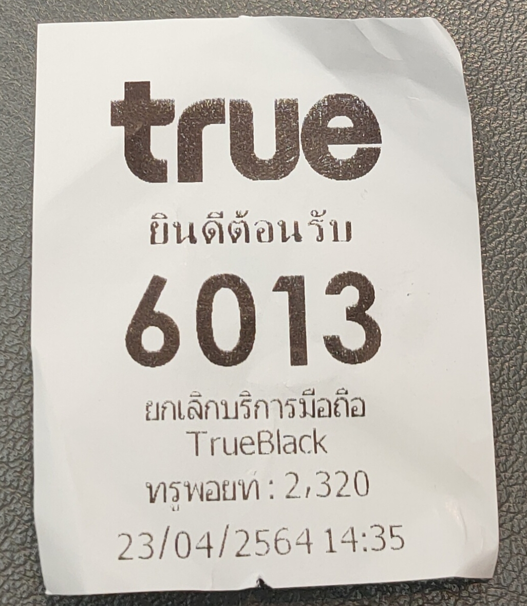เขารอสักห้านาทีก็บริการผมเอง เขาก็ให้กรอกแบบฟอร์มผมก็กรอกแล้วบอกว่าผมคิดว่าจะเปลี่ยนใจไม่ยกเลิกถ้าให้สิทธิ์ดีๆ แต่ตอนนี้แน่วแน่ว่ายกเลิกแล้วไม่สนใจข้อเสนอใดๆ ผมเสียเงินไปประมาณเกือบร้อยบาทก็จบกัน ไปหาค่ายอื่นดีกว่า