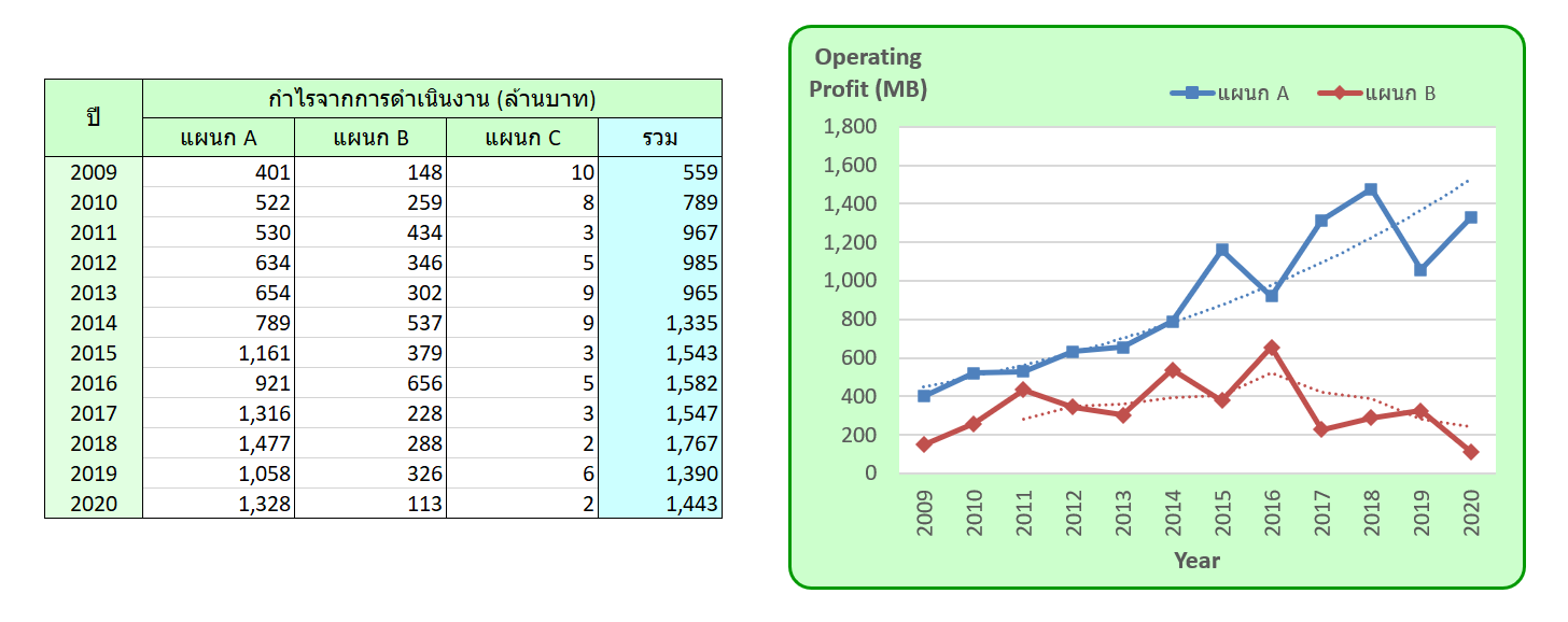 เมื่อพิจารณาในแง่สัดส่วนกำไร ช่วงหกปีแรก (2009-2014) กำไรจากแผนก A โดยเฉลี่ยจะคิดเป็น 63 เปอร์เซ็นต์ของกำไรทั้งบริษัท แต่ในหกปีหลัง (2015-2020) กำไรจากแผนก A ยิ่งมีส่วนสำคัญมากขึ้น โดยคิดเป็น 78 เปอร์เซ็นต์ของกำไรทั้งบริษัท ซึ่งเราก็น่าจะพอคาดการณ์ได้ว่า หากแนวโน้มยังคงดำเนินไปเช่นนี้ ในที่สุดแล้วกำไรเกือบทั้งหมดของบริษัทก็จะมาจากแผนก A นี่เอง และกำไรที่ลุ่ม ๆ ดอน ๆ จากแผนก B ก็จะส่งผลต่อภาพรวมน้อยลงไปเรื่อย ๆ