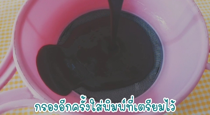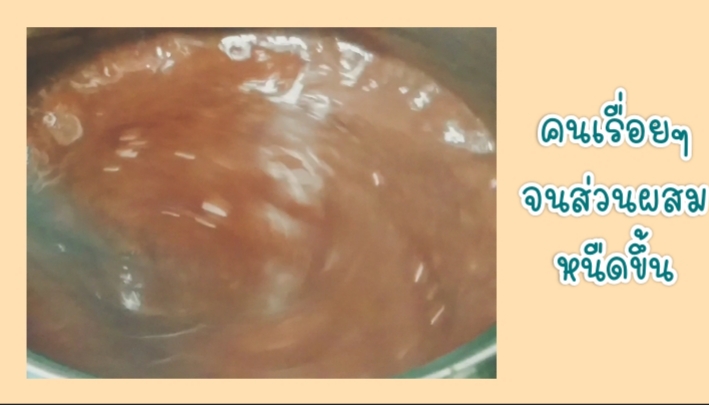 คนต่อไปเรื่อยๆจนส่วนผสมหนืด แล้วพักไว้ให้เย็น หลังจากนั้นกรองใส่ลงภาชนะที่เตรียมไว้