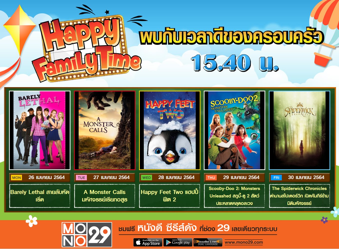 แพ็ครวมหลากหลายรสชาติภาพยนตร์ที่ใครหลายคนดูแล้วต้องอิ่มใจ ได้แก่ “สายลับหัดเริ่ด” (Barely Lethal) , “มหัศจรรย์เรียกอสูร” (A Monster Calls) , “แฮปปี้ ฟีต 2” (Happy Feet Two) , “สกูบี้-ดู 2 สัตว์ประหลาดหลุดอลเวง” (Scooby -Doo 2 : Monsters Unleashed) และ “ตำนานสไปเดอร์วิก” (The Spiderwick Chronicles) พบความสุขพร้อมความบันเทิงได้อีกมากมาย ที่ทีวีดิจิตัล หมายเลข 29 และแอปพลิเคชั่น MONO29 ติดตามรายละเอียดเพิ่มเติมได้ที่เฟซบุ๊ก MONO29