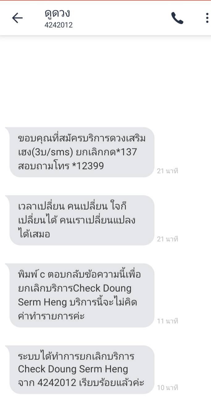 ช่วง 2 สัปดาห์ที่ผ่านมานี้ผมไม่รู้ว่าผมได้ข้อความที่คิดค่าบริการมาได้ยังไงเพราะกดยกเลิก*137 ไป 3-4 ครั้งมันก็ส่งเข้ามาใหม่เรื่อยๆ ตั้งแต่ใช้เบอร์นี้มาก็หลายปีอยู่ไม่เคยได้รับข้อความที่เสียค่าบริการเลยและ ตัวผมเองค่อนข้างมั่นใจว่าไม่ได้ไปกดลิงค์สมัครใช้บริการอะไรในเวปแปลกปลอดด้วย และยังไม่ได้ไปสมัครใช้บริการกับที่ไหนด้วยในช่วงระยะเวลา 1 เดือ
