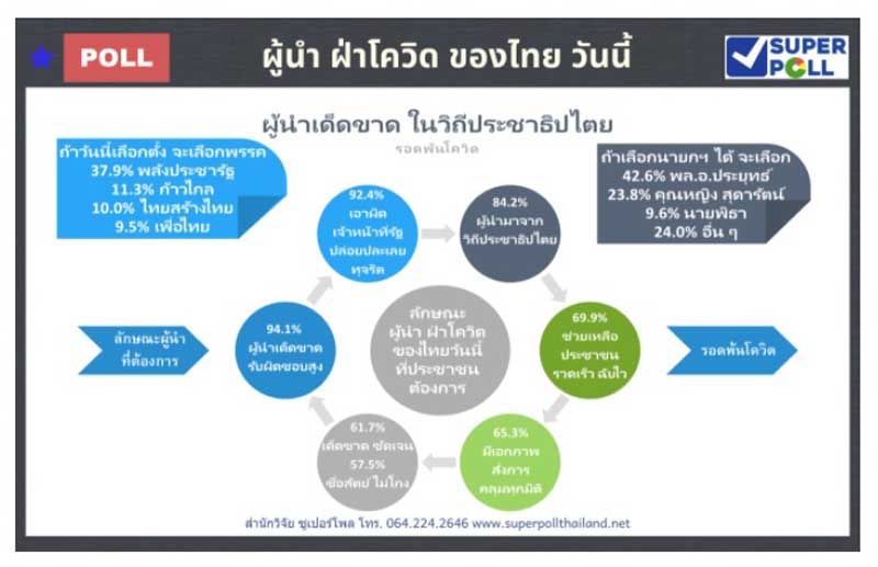 ผอ.ซูเปอร์โพล กล่าวว่า ผลโพลชิ้นนี้สะท้อนให้เห็นว่า ในภาวะวิกฤตของชาติประชาชนคนไทยต้องการผู้นำประเทศและหัวหน้าส่วนราชการในวิถีประชาธิปไตยที่โดดเด่นในทุกระดับ เปิดกว้างรับฟังข้อมูลรอบด้าน มีความรับผิดชอบสูง บริหารจัดการข้อมูลอย่างครบถ้วน ใช้คนเป็น รวดเร็ว และความเด็ดขาดสั่งการอย่างมีเอกภาพ ขณะเดียวกันต้องการให้ลงโทษเจ้าหน้าที่รัฐและผู้มีอำนาจที่ปล่อยปละละเลยให้มีซ่อง บ่อน การลักลอบเข้าเมือง อันเป็นเหตุของการแพร่ระบาดมาลงโทษโดยเร็ว