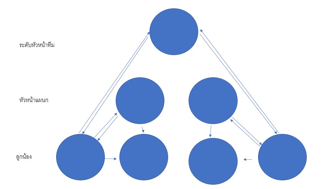 เข้าใจว่าระบบบริหาร ที่แบบ top down คือหัวหน้า สั่งหัวหน้าทีมย่อย แล้วหัวหน้าทีมย่อย ก็สื่อสารลงไปที่ลูกน้อง