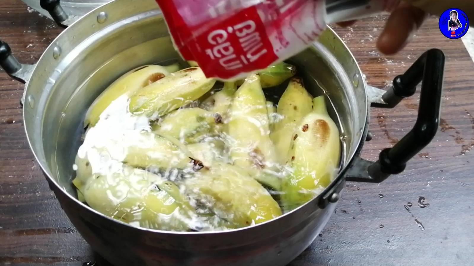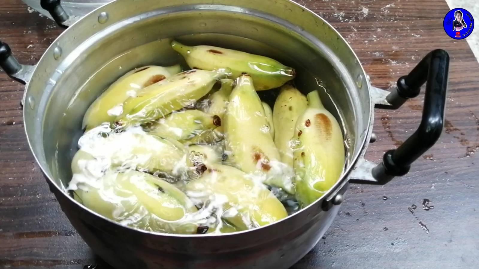 📌หลังจากนั้น นำกล้วยมาใส่หม้อต้ม ใส่น้ำเปล่าลงไปให้ท่วมตัวกล้วย