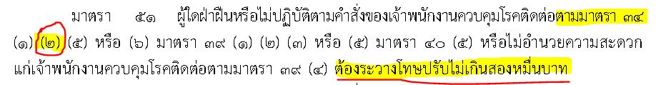 ผู้ฝ่าฝืนหรือไม่ปฏิบัติตามคำสั่งของเจ้าพนักงานควบคุมโรคดังกล่าว ไม่ยอมไปฉีดวัคซีนฯ โดยไม่มีเหตุอันควร ก็มีบทลงโทษตามกฎหมายคือโทษปรับไม่เกิน 2 หมื่บาท ตามมาตรา 51