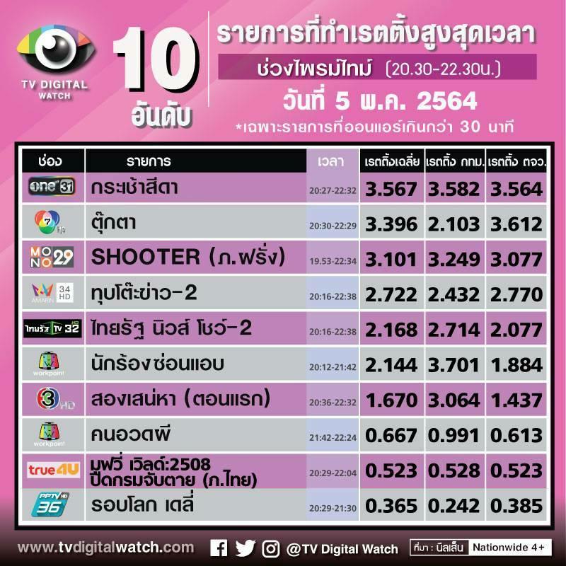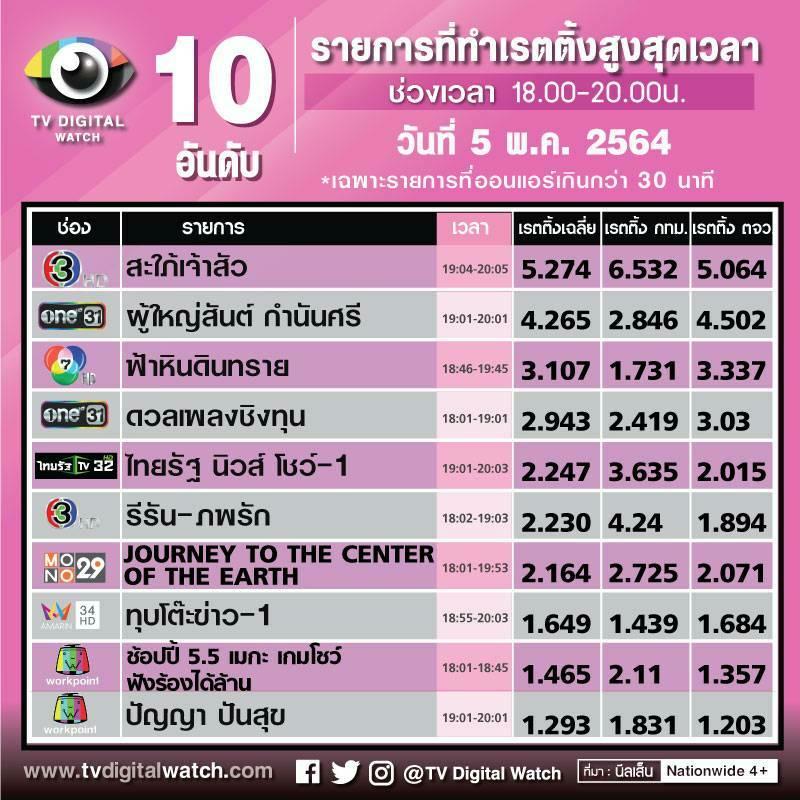 10 อันดับรายการเรตติ้งสูงสุด ประจำวันพุธที่ 5 พ.ค. 2564