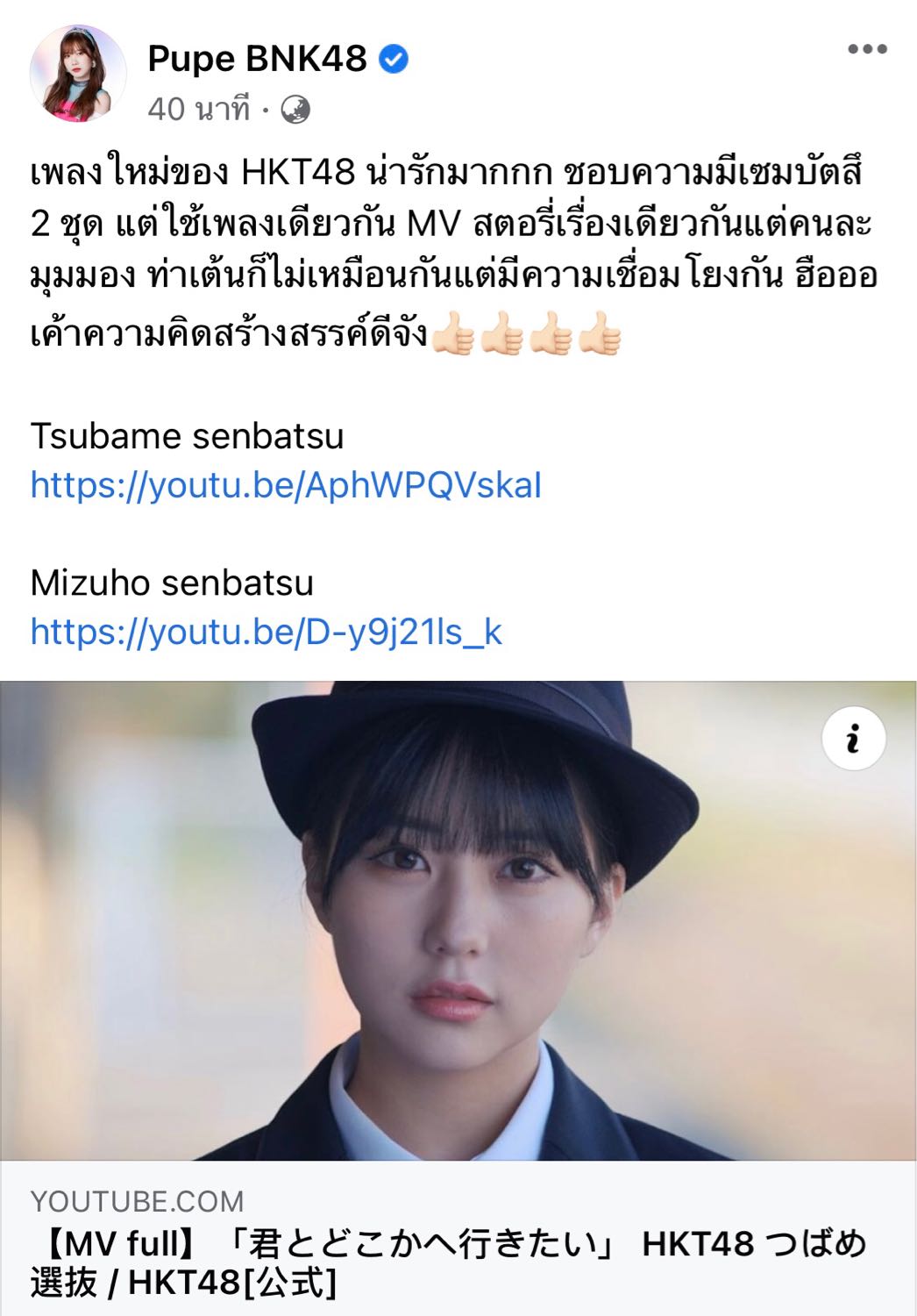 เห็นโพสของพิเป้พูดถึงเพลงใหม่ของ HKT48 ที่มีเซ็มบัตสึ 2 ชุด แต่ใช้เพลงเดียวกัน MV สตอรี่เรื่องเดียวกันแต่คนละมุมมอง ท่าเต้นก็ไม่เหมือนกันแต่มีความเชื่อมโยงกัน