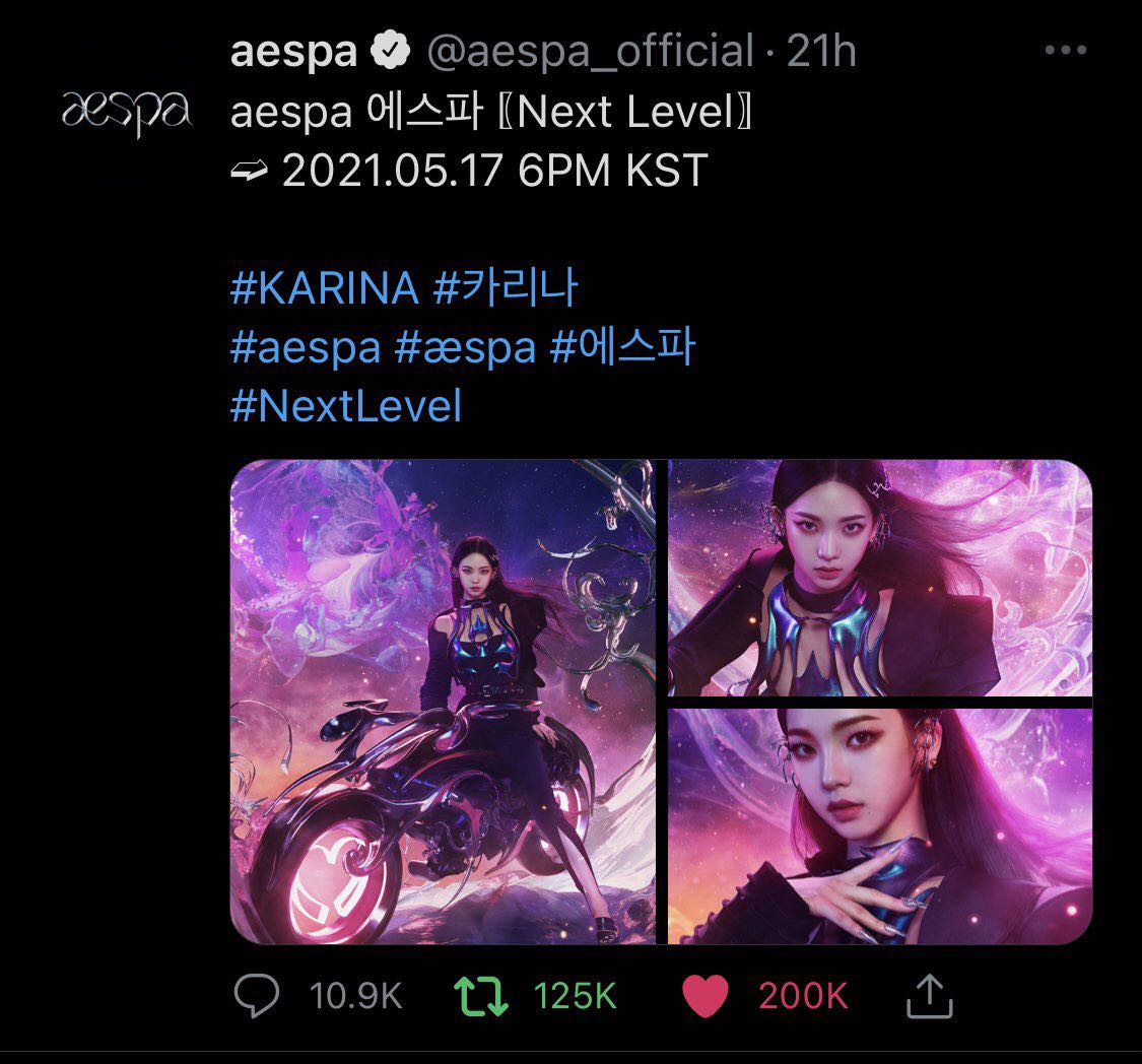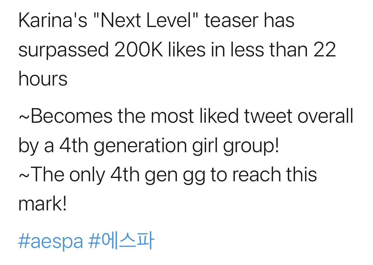 ตอนนี้ทีเซอร์ "Next Level" ของ Karina มียอดกดไลก์ทะลุ 200K ในเวลาไม่ถึง 22 ชั่วโมง (ทำเวลาไป 21 ชั่วโมง)