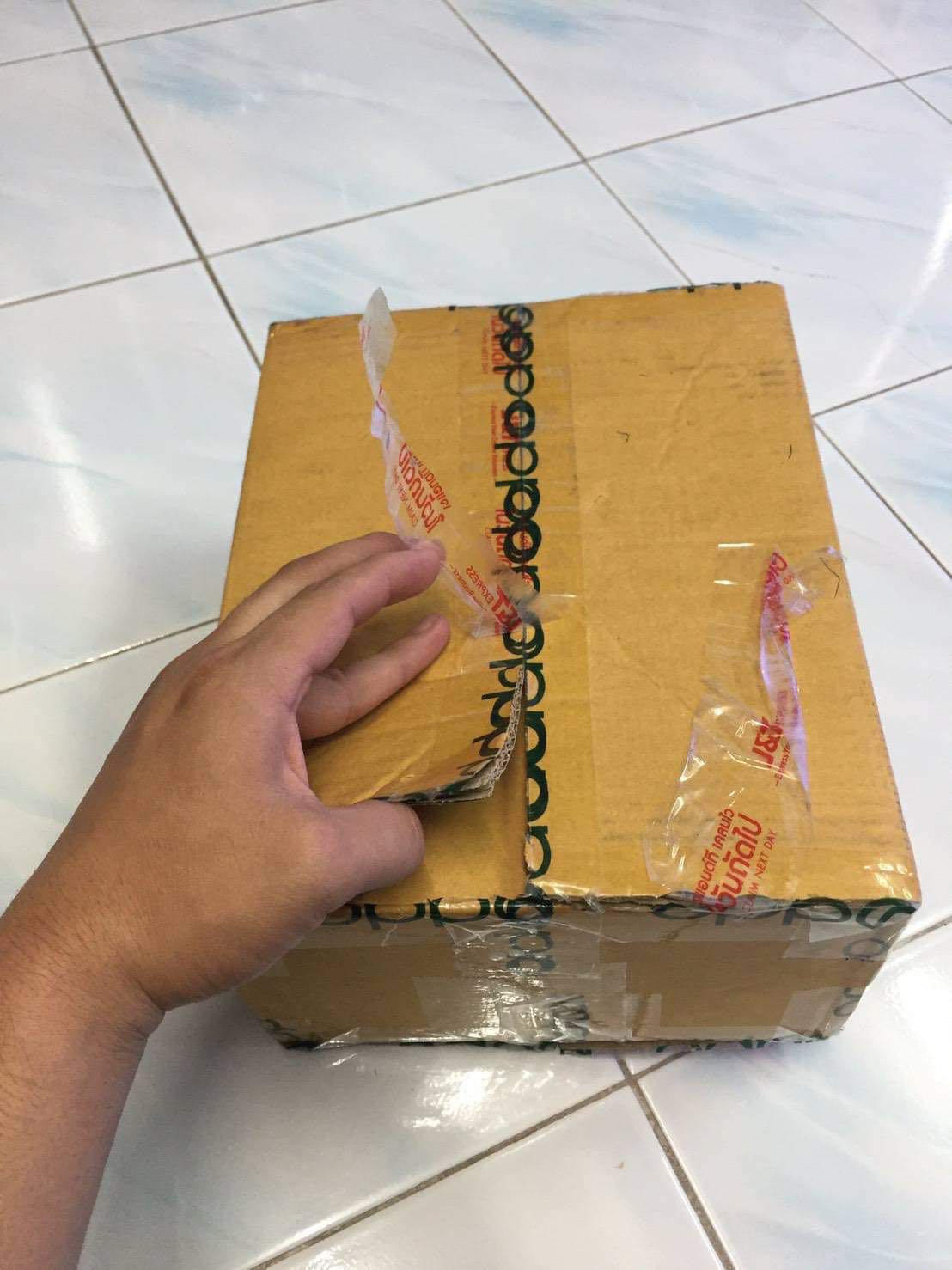 3. สาขาปลายทาง - สินค้าถูกแปะทับด้วยเทปปิดกล่องของขนส่ง J&T เรียบร้อยแล้ว แต่พนักงานก็ดำเนินการส่งสินค้าตามปกติ