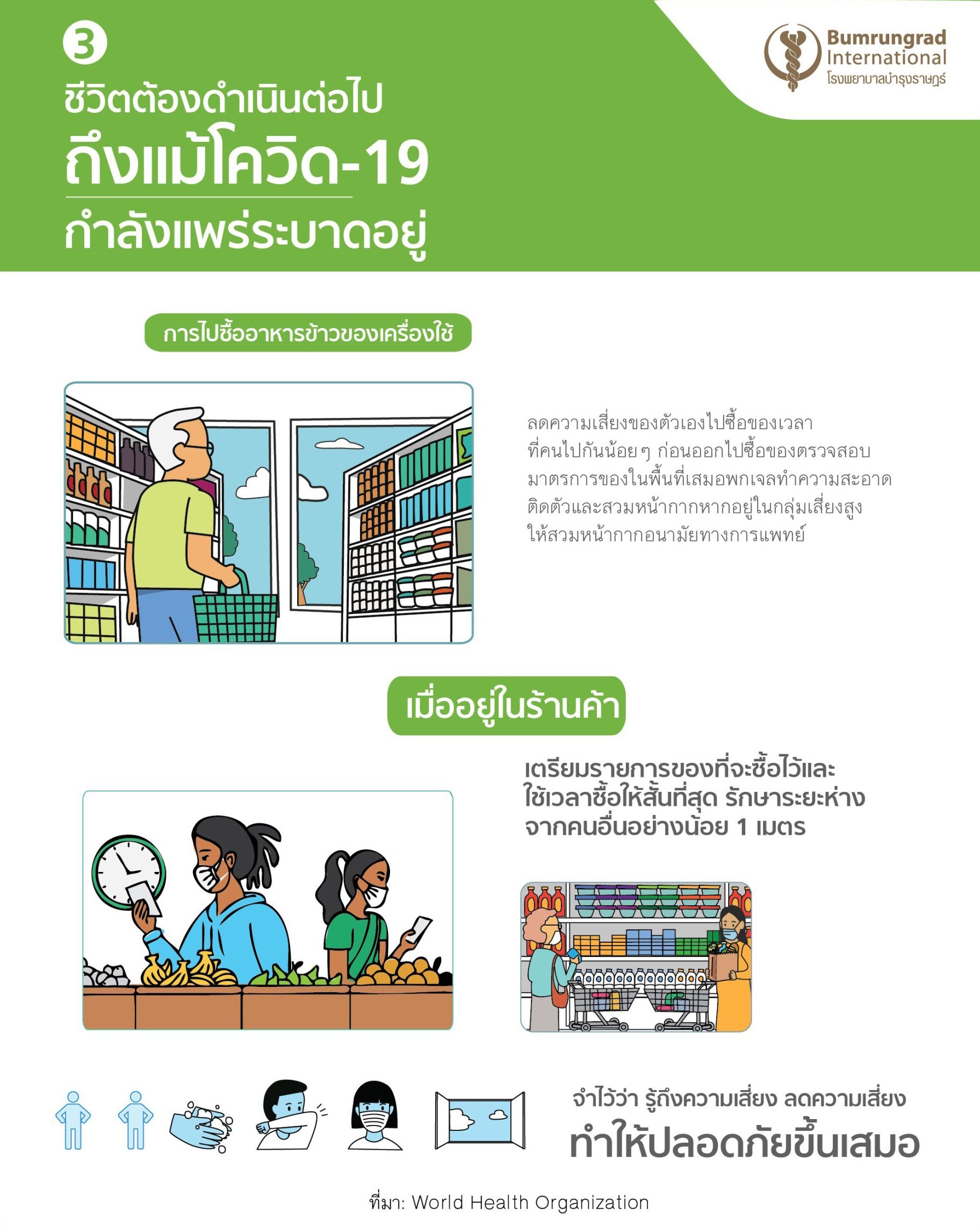 เตรียมรายการของที่จะซื้อไว้และใช้เวลาซื้อให้สั้นที่สุด รักษาระยะห่างจากผู้อื่นอย่างน้อย 1 เมตร