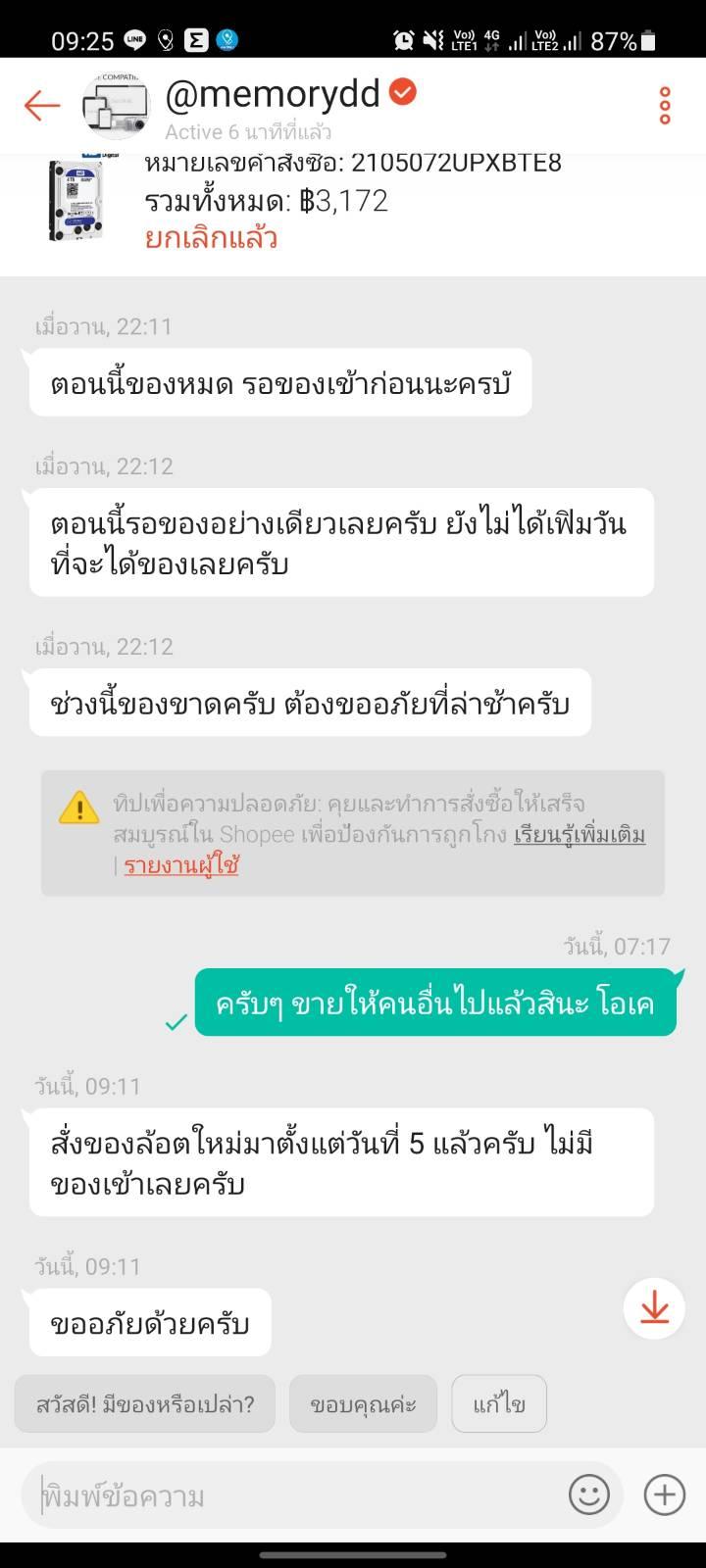 คือเรื่องมีอยู่ว่าผมสั่งของไปแล้วและช่วงนั้นราคาถูกผมเลยสอบถามร้านให้ส่งวันที่ 15 ได้ไหมเพราะผมสะดวกรับตอนนั้น ทางร้านก็บอกสั่งได้เลยพร้อมกดขยายเวลา เมื่อวันที่ 7 ผมก็แอบเช็คตลอดนะว่า มันหมดยัง ก็ค่อยๆหมดจนผมสั่งเหลือ 4 ชิ้น ผ่านไป 2 ชม. ได้ก็หมด (ถ้าของหมดทำไมไม่หมดตั้งแต่เว็บทำไมเหลือ 4 ชิ้น)